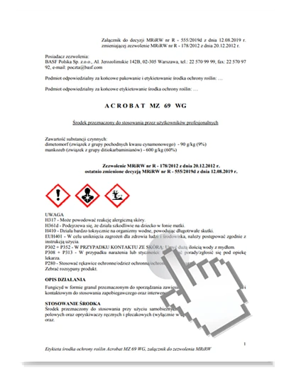 Pełne stosowanie znajdziesz w etykiecie środka ochrony roślin Acrobat MZ 69 WG poniżej.