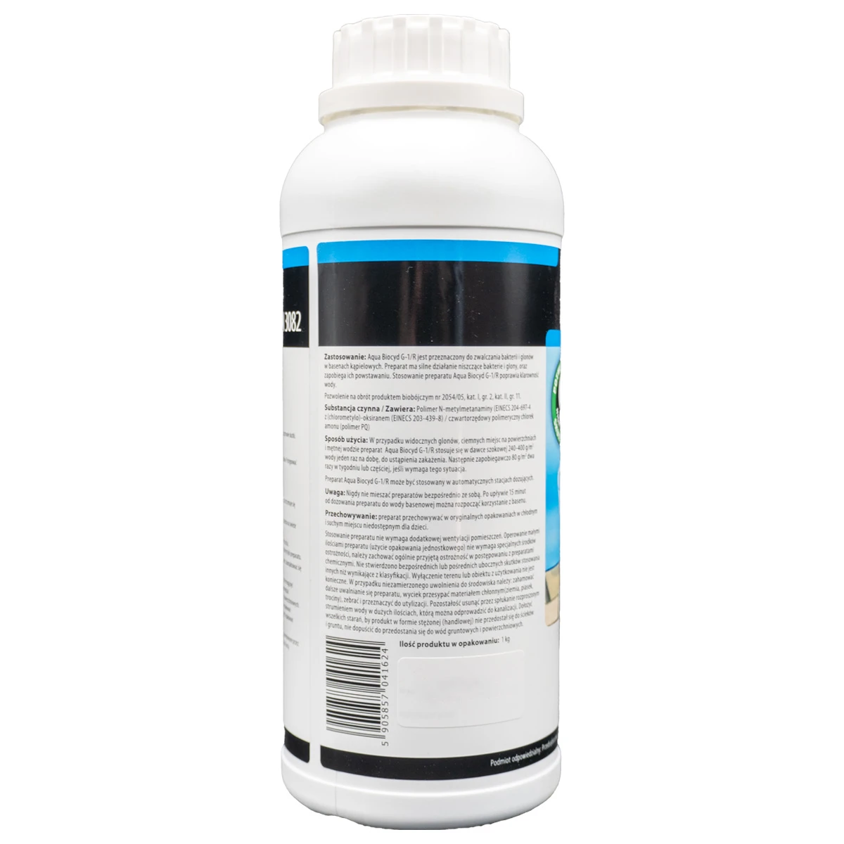 AQUA BIOCYD G-1/R to gwarancja czystej wody i bezpiecznej kąpieli. Ze względu na zawartą substancję aktywną (polimeryczny IV-rzędowy chlorek amoniowy) preparat ten zalecany jest dla basenów o pojemności do 10m3.