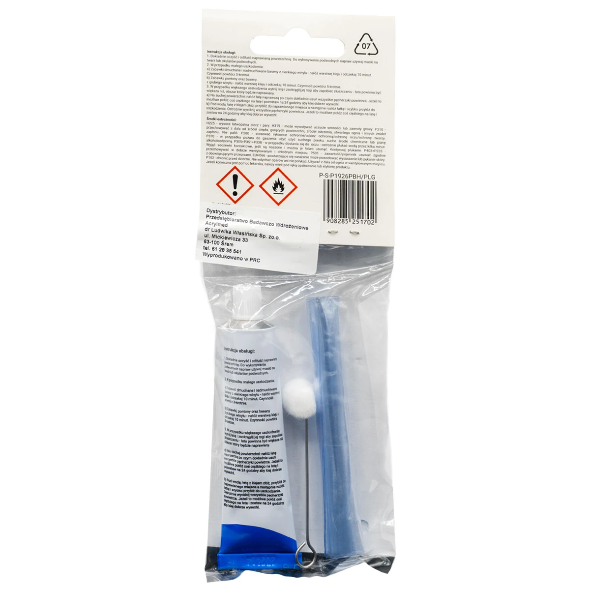 Zestaw naprawczy do basenów Acrylmed to niezawodne rozwiązanie do szybkiego usuwania uszkodzeń w dmuchanych akcesoriach, takich jak baseny, materace, pontony czy zabawki plażowe. W zestawie znajduje się klej winylowy o pojemności 30 ml, dwie łatki PVC o wymiarach 10 × 20 cm oraz pędzelek ułatwiający precyzyjne nakładanie kleju. Łatki są elastyczne i dobrze dopasowują się do kształtu powierzchni, a klej zapewnia trwałe i wodoodporne połączenie. Produkt sprawdza się zarówno przy naprawie na sucho, jak i pod wodą.