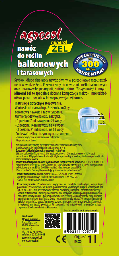Nawóz do roślin balkonowych i tarasowych Mineral Żel Agrecol to płynny nawóz mineralny CE w postaci łatwo rozpuszczalnego w wodzie żelu, przeznaczony do regularnego zasilania roślin uprawianych na balkonach i tarasach. Produkt został opracowany z myślą o intensywnie kwitnących roślinach ozdobnych, które uprawiane w pojemnikach wymagają systematycznego uzupełniania składników pokarmowych.