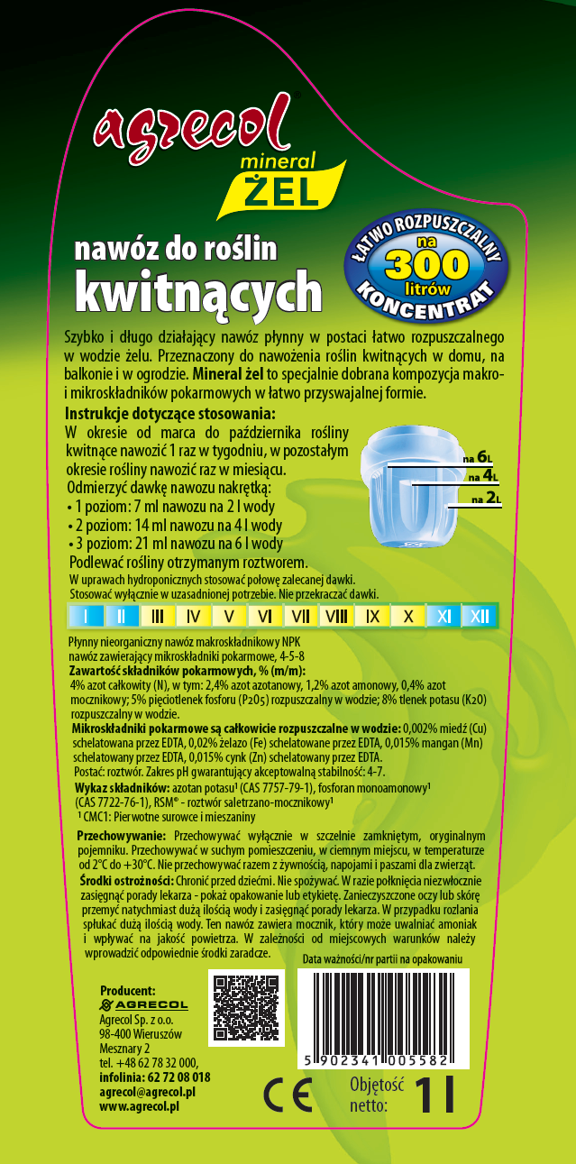 Nawóz do roślin kwitnących Mineral Żel Agrecol to nowoczesny nawóz mineralny CE w formie płynnego, łatwo rozpuszczalnego w wodzie żelu. Produkt przeznaczony jest do nawożenia roślin w okresie poprzedzającym kwitnienie oraz w trakcie intensywnego rozwoju kwiatów. Specjalnie opracowana formuła zapewnia szybkie przyswajanie składników pokarmowych oraz ich długotrwałe działanie, co sprzyja obfitemu i równomiernemu kwitnieniu.