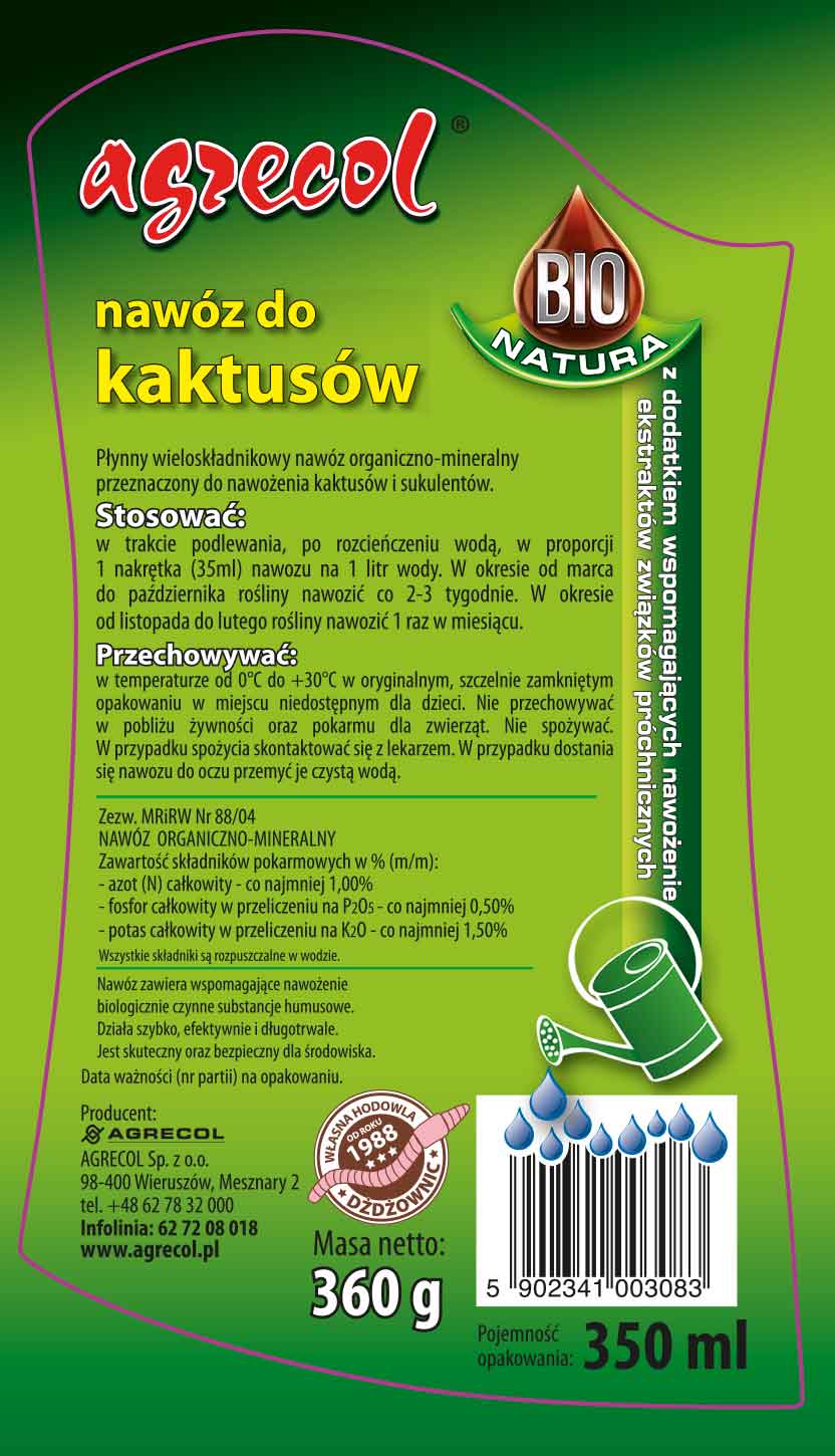 Nawóz do kaktusów Agrecol to płynny nawóz organiczno-mineralny przeznaczony do nawożenia sukulentów, w tym kaktusów oraz innych roślin gruboszowatych