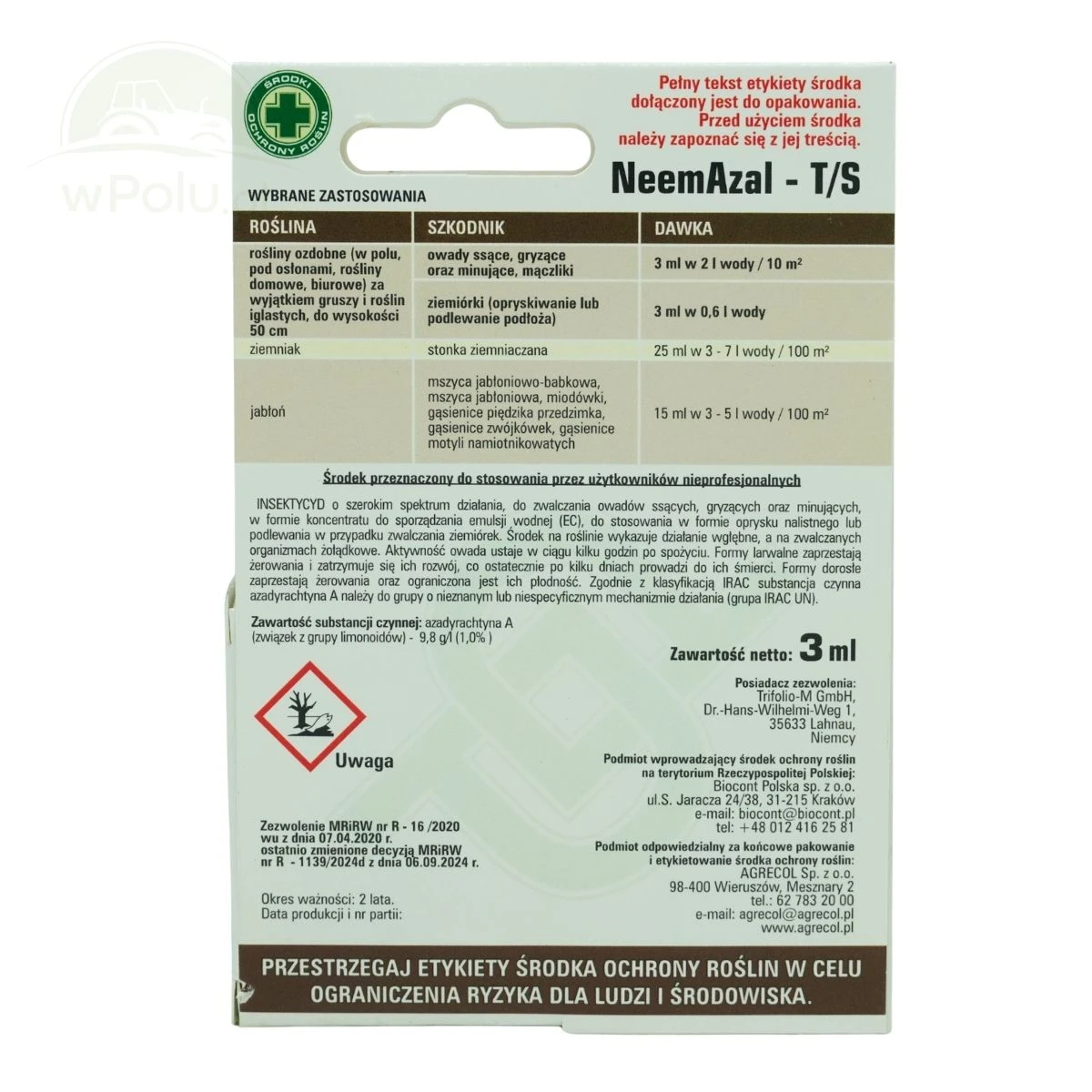 NeemAzal T/S to skuteczny insektycyd przeciwko owadom ssącym, gryzącym i minującym. Zawarta w nim substancja czynna pochodzi z ekstraktu drzewa neem, co gwarantuje działanie wgłębe odporne na deszcz. Środek działa na szkodniki żołądkowo. Środek NeemAzal T/S eliminuje owady ssące, gryzące oraz minujące, m.in. mszyce, stonkę ziemniaczaną, ziemiórki, gąsienice, chrząszcze, mączliki i miodówki. Jego działanie ogranicza żarłoczność larw i owadów dorosłych, a także redukuje płodność szkodników. Chroni rośliny owocowe, warzywne, ozdobne, a także doniczkowe w domu, ogrodzie i na balkonie. Niezwykle skuteczny, a przy tym bezpieczny dla pszczół i innych pożytecznych organizmów, jest idealnym wyborem dla ekologicznych upraw.