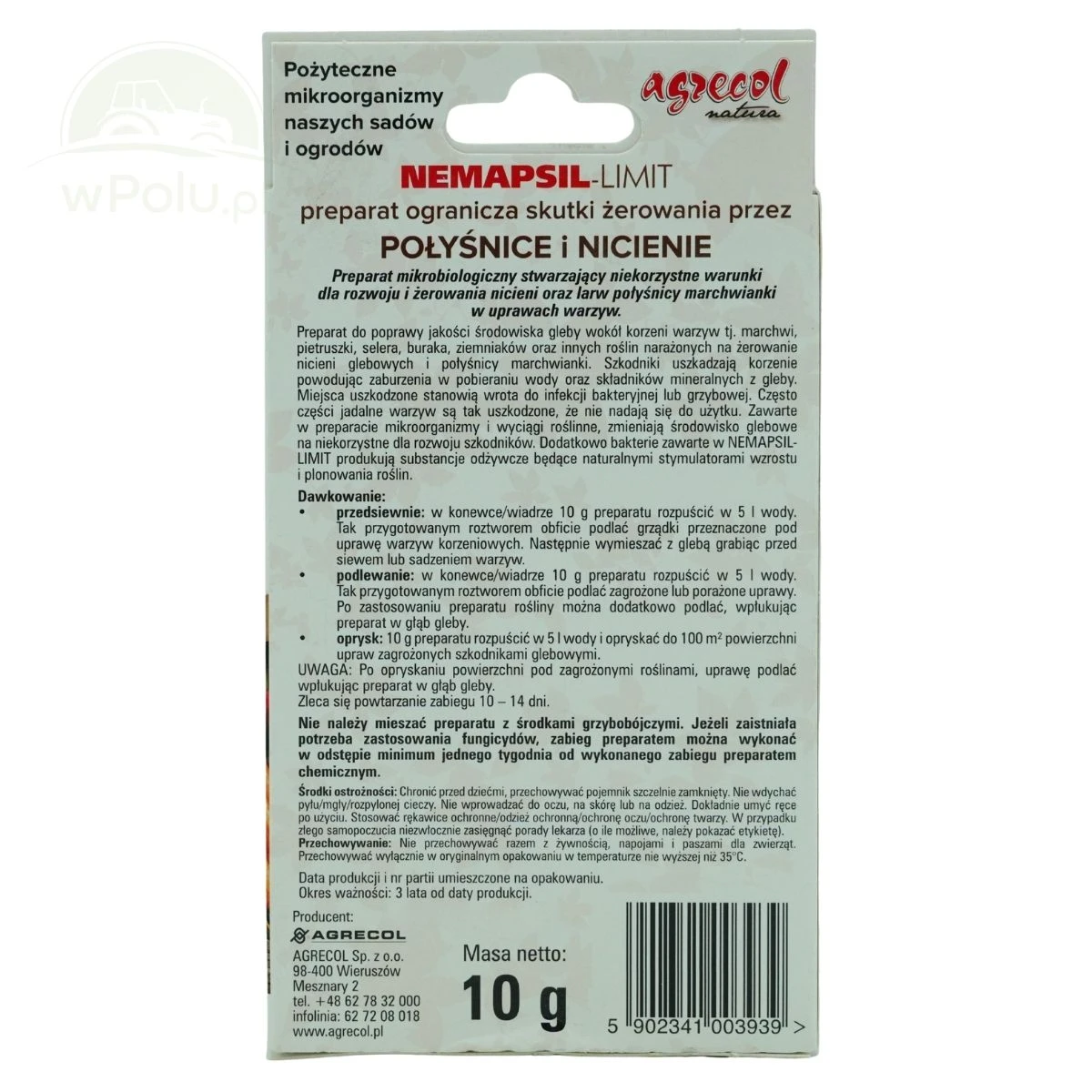 Nemapsil-LIMIT to mikrobiologiczny preparat zawierający pożyteczne mikroorganizmy, który poprawia zdrowotność roślin oraz ogranicza uszkodzenia korzeni i bulw warzyw. Jest bezpieczny dla ludzi i zwierząt.