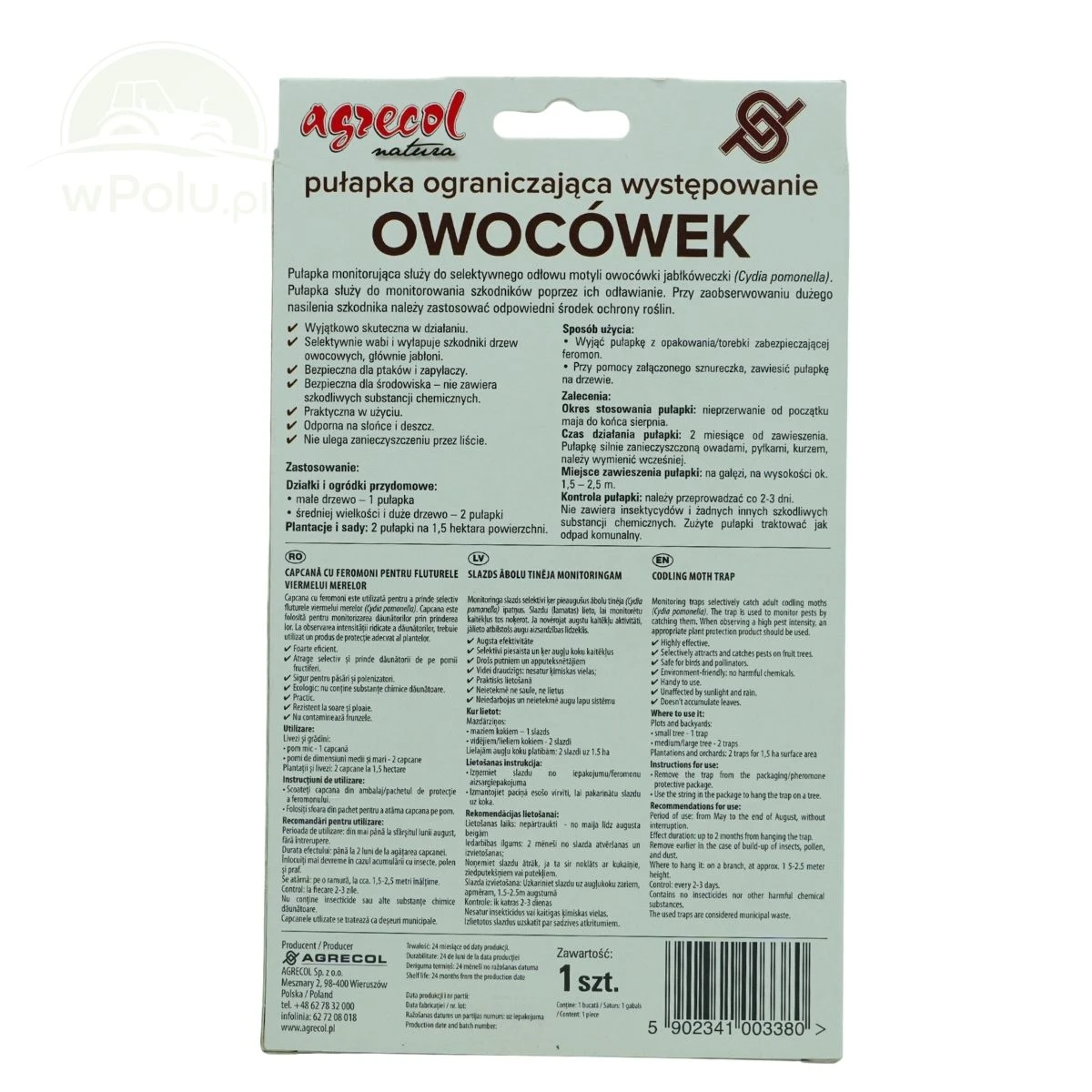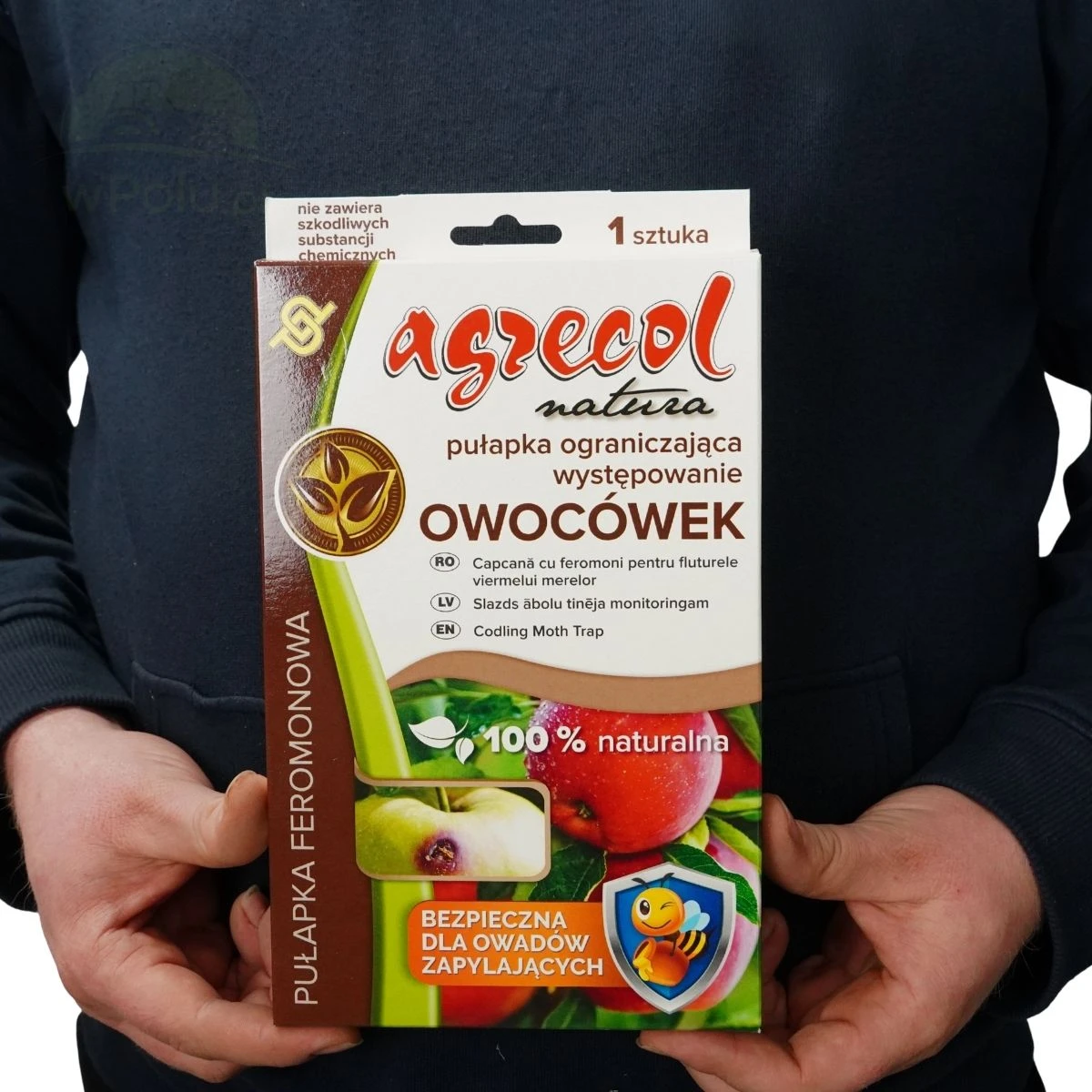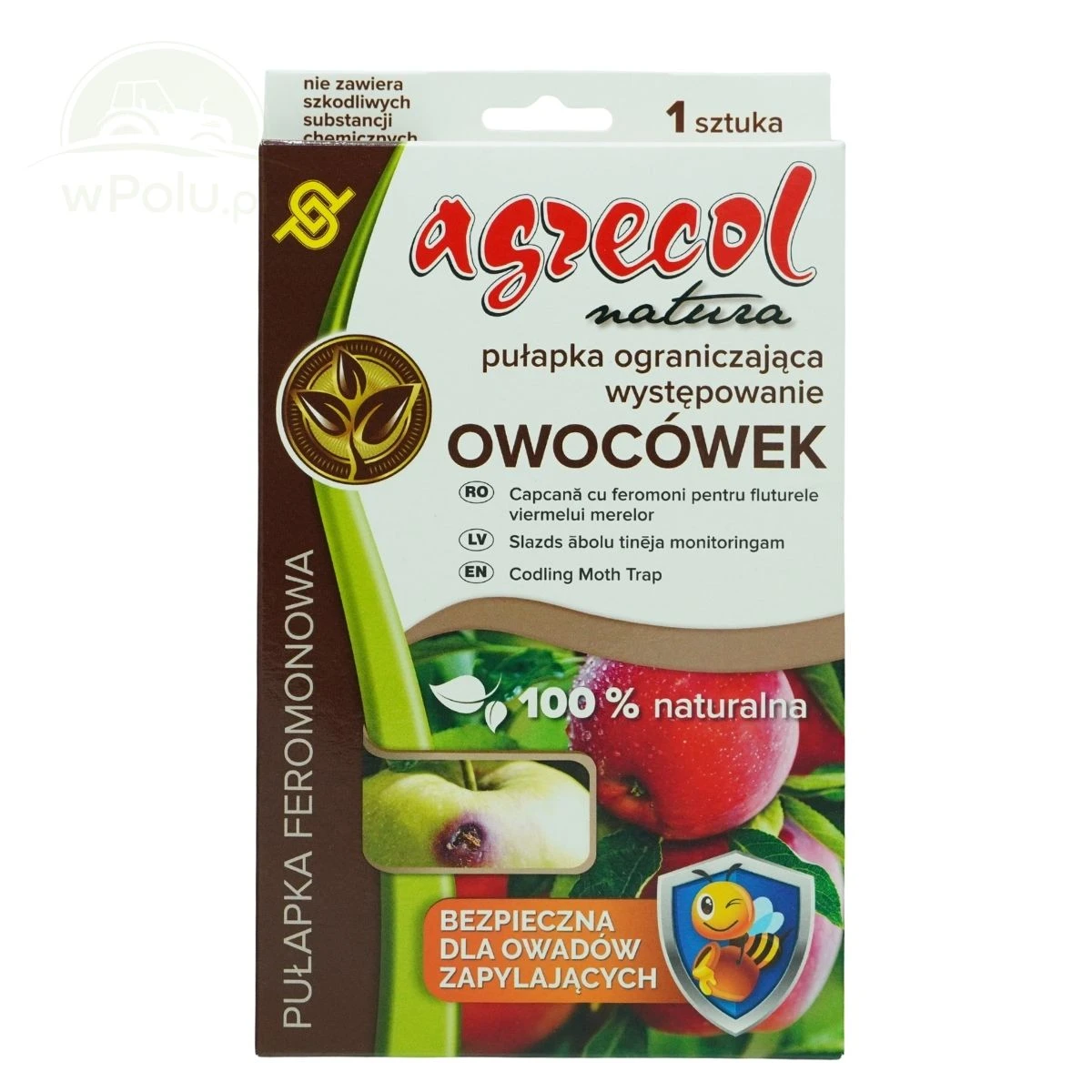 Pułapka feromonowa do odłowu owocówki jabłkóweczki. Pułapka skutecznie przyciąga i wyłapuje owocówkę jabłkóweczkę (Cydia pomonella), groźnego szkodnika drzew owocowych, głównie jabłoni. Jest łatwa w użyciu, bezpieczna dla ludzi, zwierząt domowych i owadów zapylających, oraz przyjazna dla środowiska, ponieważ nie zawiera szkodliwych substancji chemicznych. Działa 2 miesiące od zawieszenia.