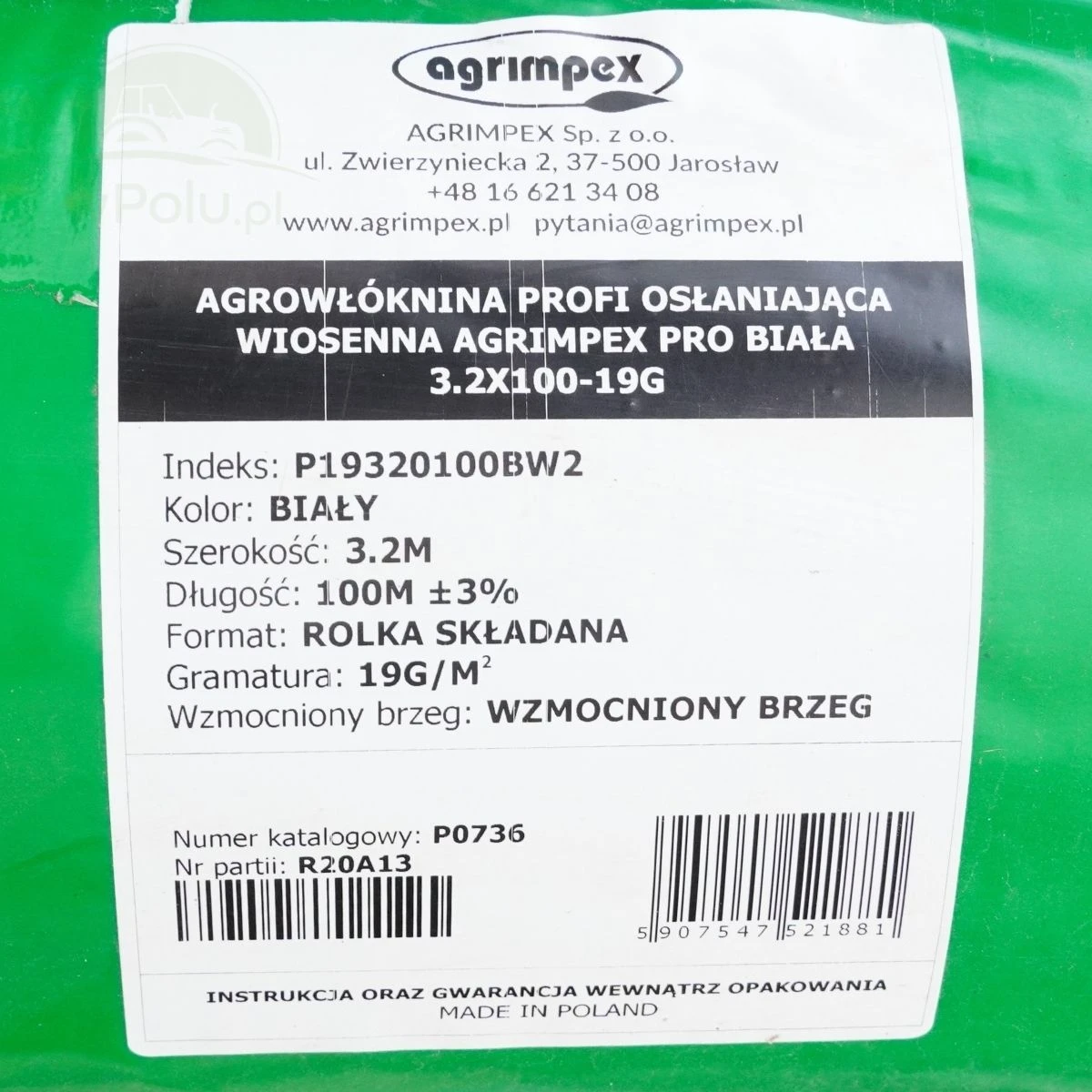 Agrowłóknina Agrimpex PRO P19 6,35 X 100 MB to wielosezonowa biała włóknina okryciowa przeznaczona do profesjonalnych upraw rolniczych, warzywniczych i sadowniczych. Chroni rośliny w okresie wiosenno-jesienno-zimowym przed przymrozkami, silnym wiatrem, gradem oraz zbyt intensywnym nasłonecznieniem. Dzięki trwałej, elastycznej strukturze dobrze dopasowuje się do upraw, a jednocześnie zapewnia przepływ wody i powietrza, co ogranicza ryzyko gnicia roślin. Dodatkowo stanowi barierę dla ptaków i owadów, sprzyjając zdrowemu wzrostowi roślin oraz wcześniejszemu uzyskaniu plonów.