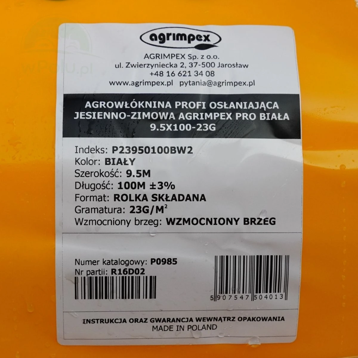 Agrowłóknina Agrimpex PRO P23 9,5 X 100 MB WB to wysokiej jakości wielosezonowa agrowłóknina biała, stworzona z myślą o profesjonalnych uprawach rolniczych, warzywniczych i sadowniczych przeznaczona do osłony upraw w okresie wiosenno-jesienno-zimowym. Zapewnia skuteczną ochronę roślin przed niekorzystnymi warunkami atmosferycznymi, takimi jak przymrozki, silny wiatr, grad czy intensywne nasłonecznienie. Dzięki swojej trwałości i elastyczności idealnie dopasowuje się do upraw, wspierając ich zdrowy wzrost i rozwój. Struktura materiału umożliwia przepływ wody i powietrza, co zapobiega gniciu roślin. Stanowi także efektywną barierę przeciw ptakom i owadom.