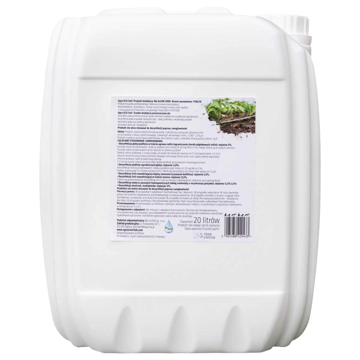 Agro Eca Soil 20 L to innowacyjny preparat przeznaczony do poprawy jakości i aktywności biologicznej gleby, stworzony z myślą o nowoczesnym, świadomym rolnictwie. Jego unikalna formuła oparta jest na elektrolizowanej wodzie (ECA), zawierającej czysty kwas podchlorawy (HOCl) – aktywną, naturalnie występującą substancję o silnym działaniu biobójczym. Preparat nie zawiera balastu sodowego (Na+), a jedynie śladowe ilości potasu (K+), co czyni go bezpiecznym i przyjaznym dla gleby oraz środowiska.