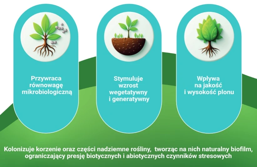 zawiera wyselekcjonowane szczepy bakterii z rodzaju Bacillus, które wykazują dwukierunkowe działanie fungistatyczne – ograniczają rozwój patogenów glebowych oraz osłabiają czynniki stresowe wpływające na część nadziemną roślin. Bakterie te kolonizują system korzeniowy i tworzą naturalny biofilm ochronny, który:
