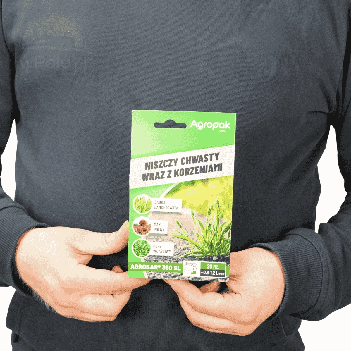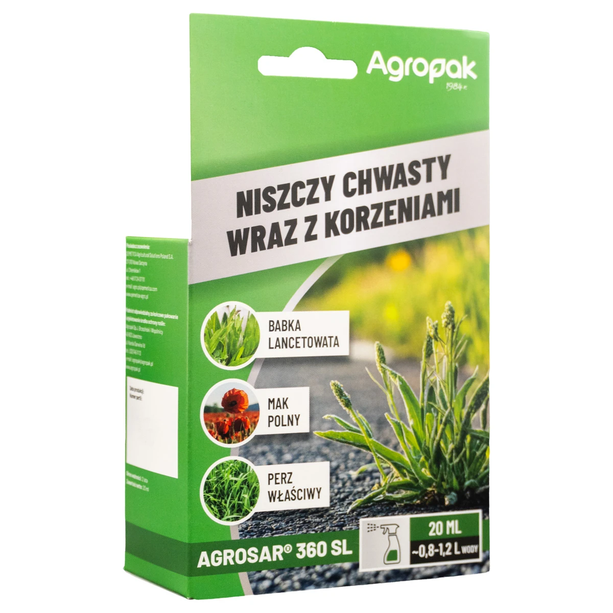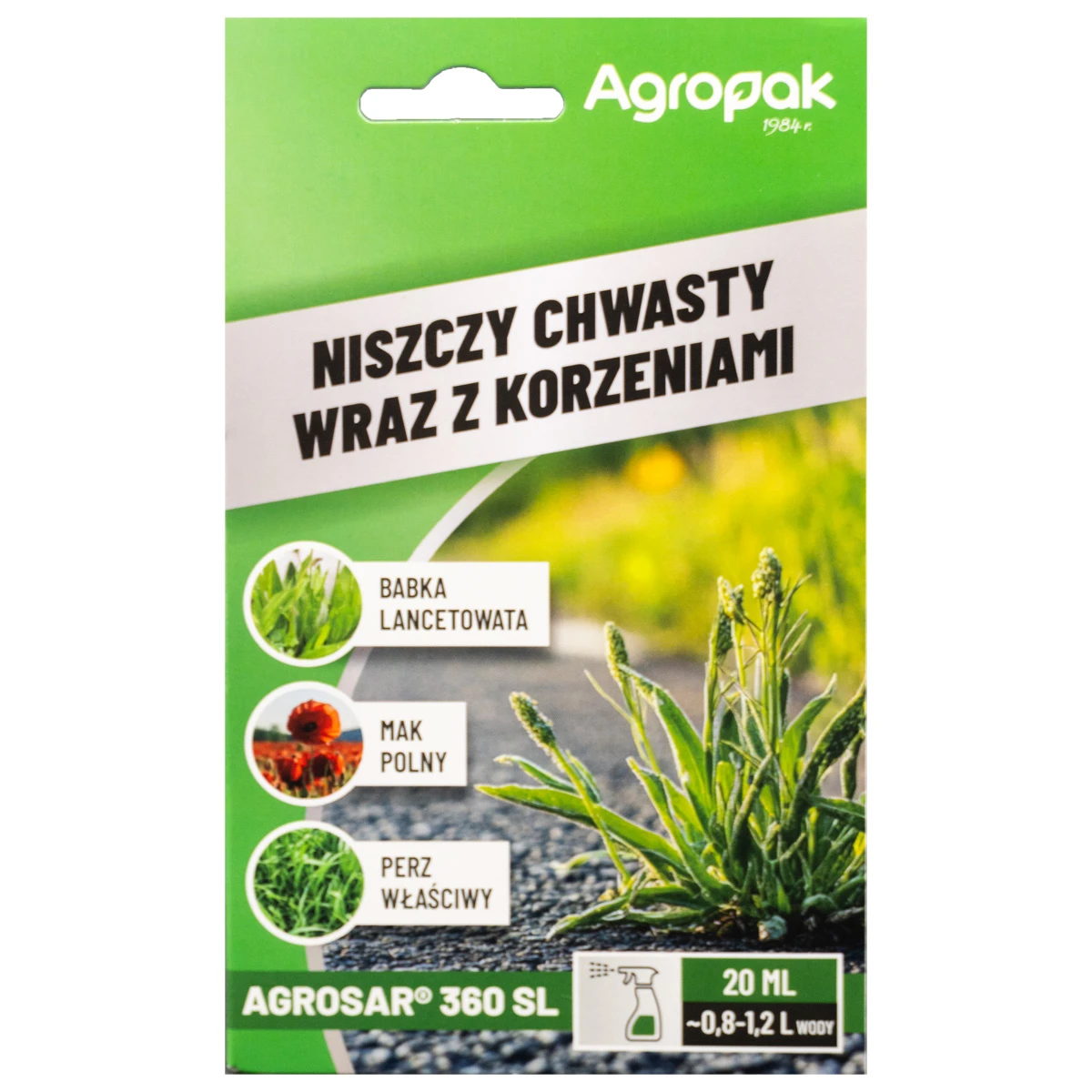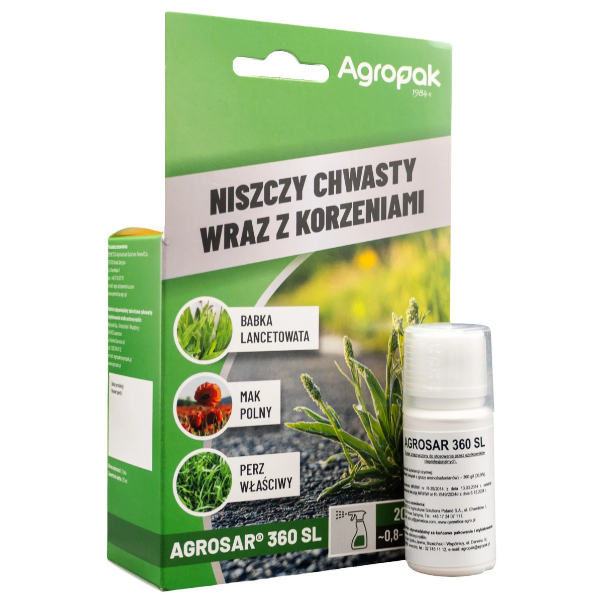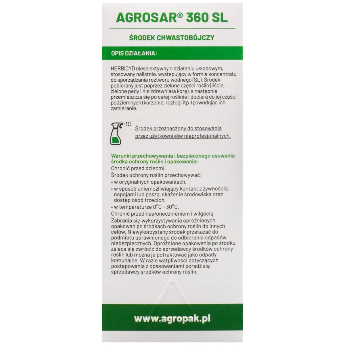Agrosar to nieselektywny środek chwastobójczy o działaniu układowym. Przeznaczony do stosowania nalistnego na perz właściwy, komosę białą, mak polny oraz wiele innych chwastów jednoliściennych i dwuliściennych, zarówno rocznych, jak i wieloletnich w uprawie jabłoni oraz innych drzew i krzewów owocowych, wokół drzew i kęp kwiatów, pod żywopłotami i krzewami, w ogrodach i na działkach. Występuje w formie koncentratu do sporządzania roztworu wodnego (SL). Agrosar 360 SL może być stosowany przy użyciu opryskiwacza ręcznego (w tym plecakowego).