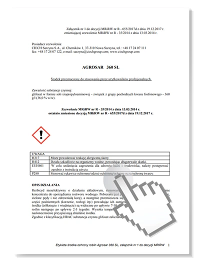 Pełne stosowanie znajdziesz w etykiecie środka ochrony roślin Agrosar 360 SL poniżej.