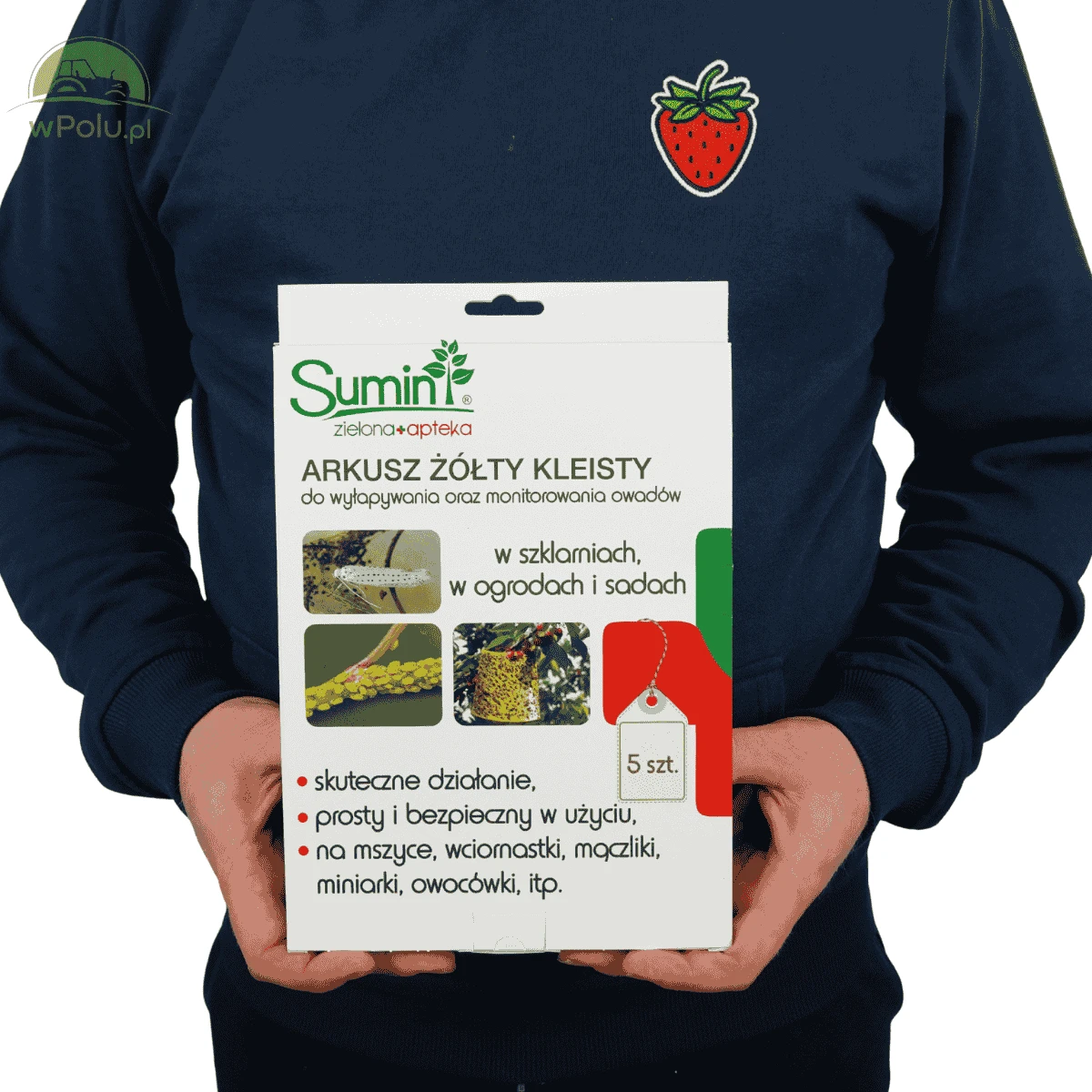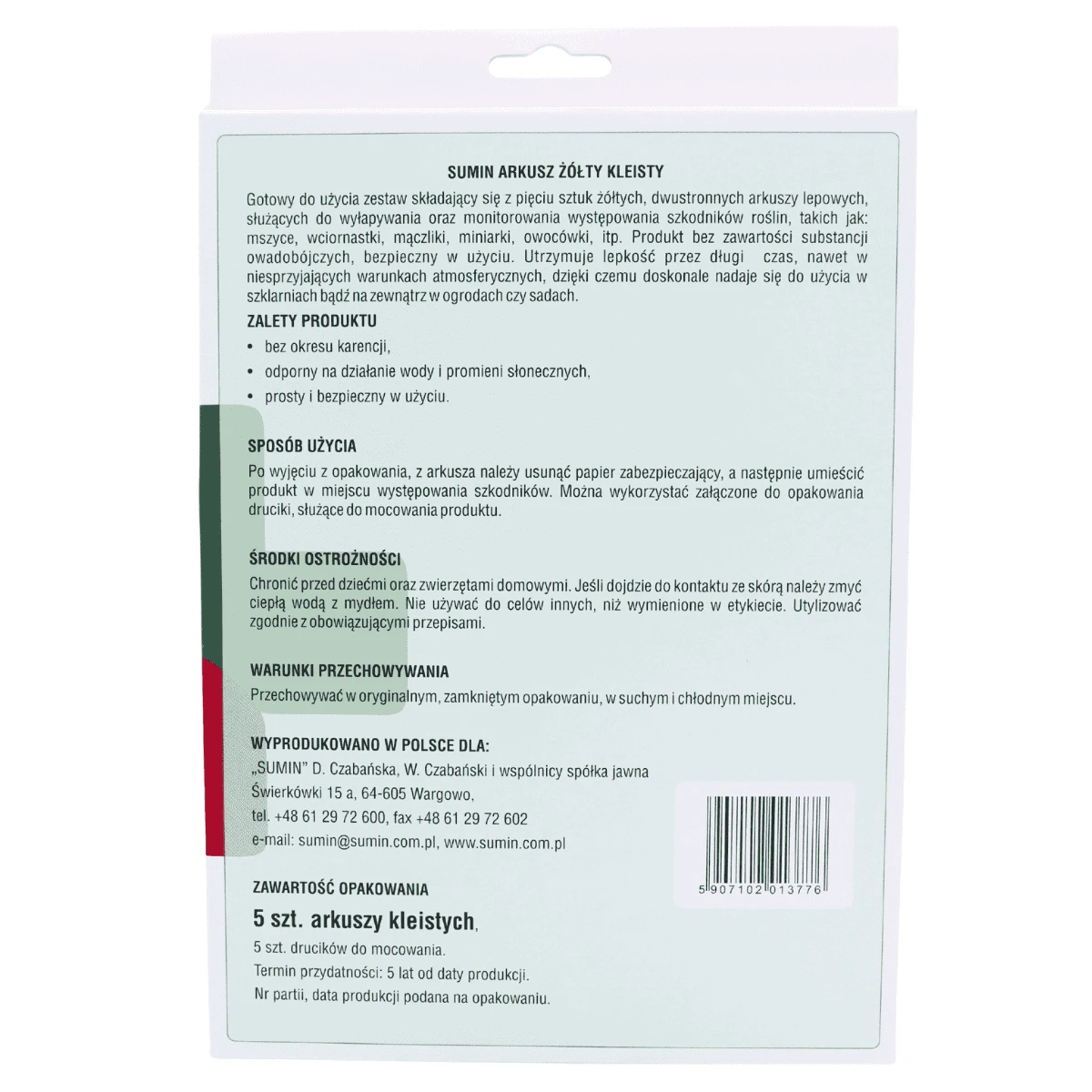 Gotowy do użycia zestaw pięciu sztuk żółtych dwustronnych arkuszy lepowych służących do wyłapywania oraz monitorowania szkodników, takich jak: mszyce, wciornastki, miniarki, mączliki, owocówki i innych.