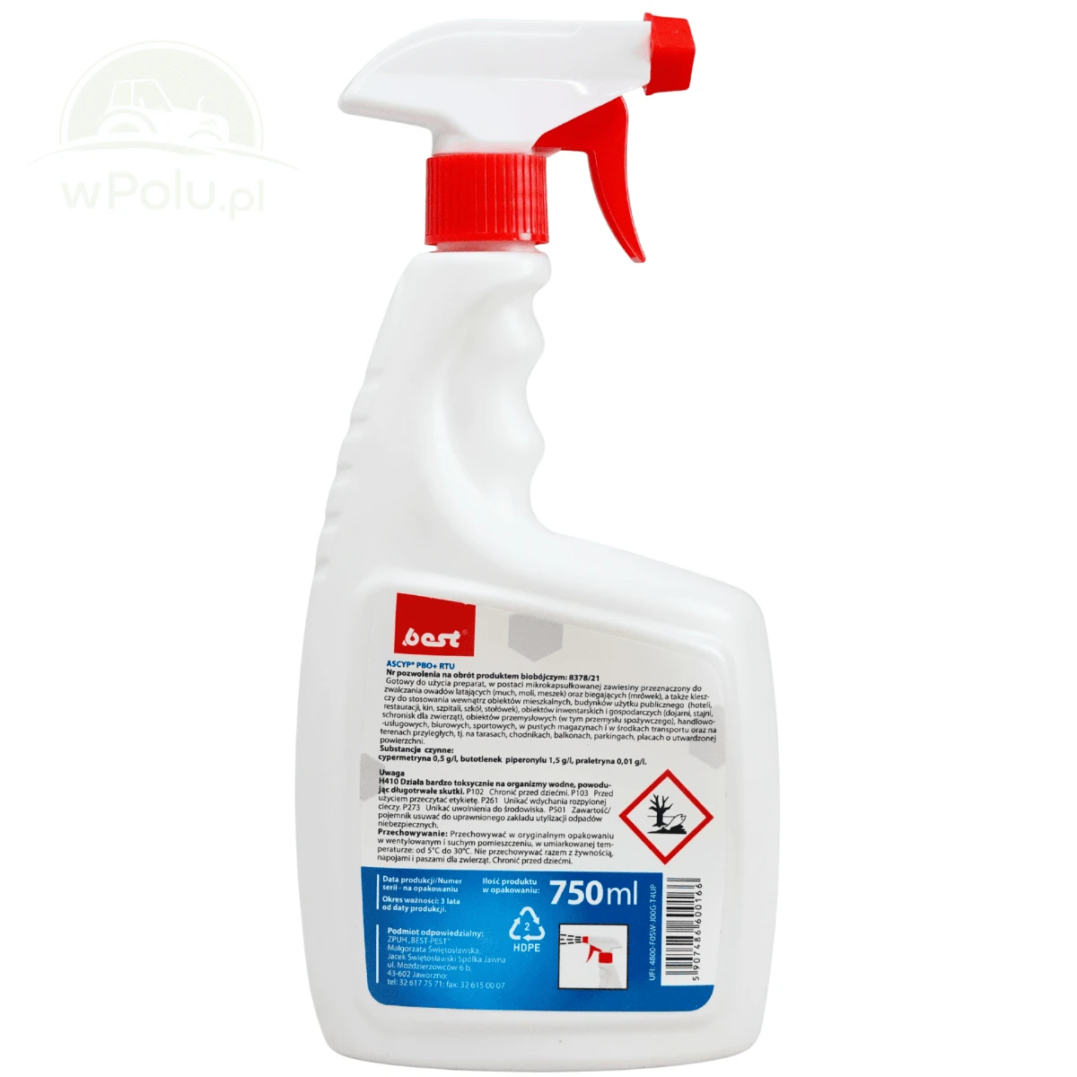 ASCYP PBO+ RTU 750 ml to skuteczny i wygodny w użyciu preparat, który łączy szerokie spektrum działania, gotową formę oraz wysoką efektywność. To sprawdzony wybór dla osób poszukujących niezawodnego rozwiązania w walce z owadami i kleszczami w różnych typach obiektów.