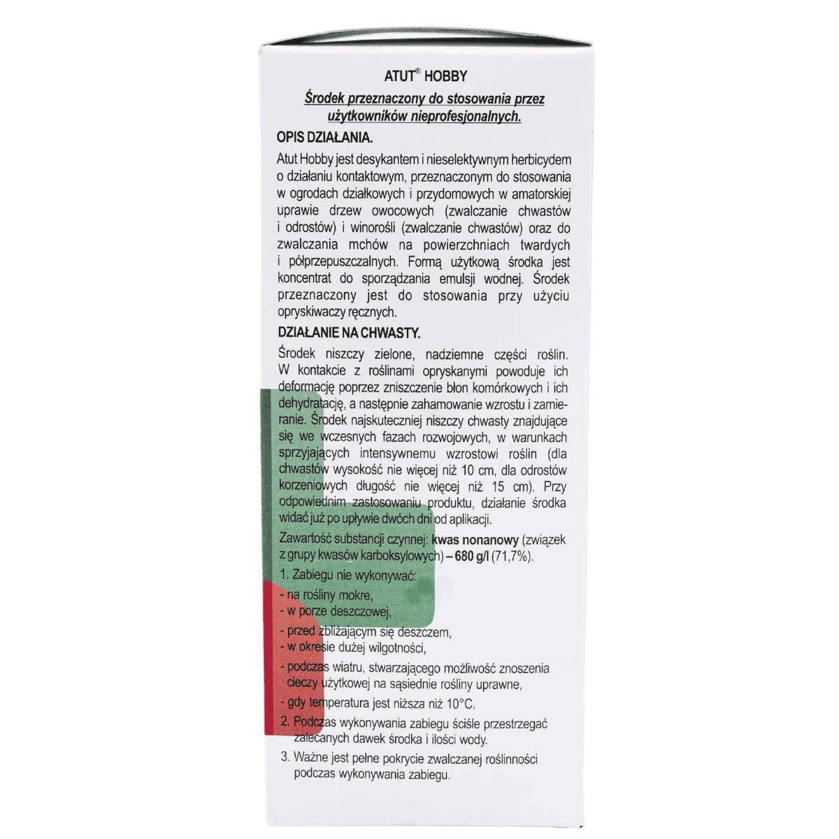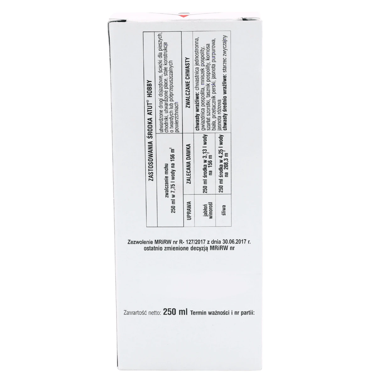Środek niszczy zielone, nadziemne części roślin, ich błony komórkowe oraz powoduje ich dehydratację, co prowadzi do deformacji chwastów. Następnie dochodzi do zahamowania wzrostu i zamierania. Atut Hobby najskuteczniej niszczy chwasty we wczesnych fazach rozwojowych. Szczególnie w warunkach sprzyjających intensywnemu wzrostowi roślin (dla chwastów wysokość nie więcej niż 10 cm, dla odrostów korzeniowych długość nie więcej niż 15 cm). Działanie środka widać już po około dwóch dniach od aplikacji.