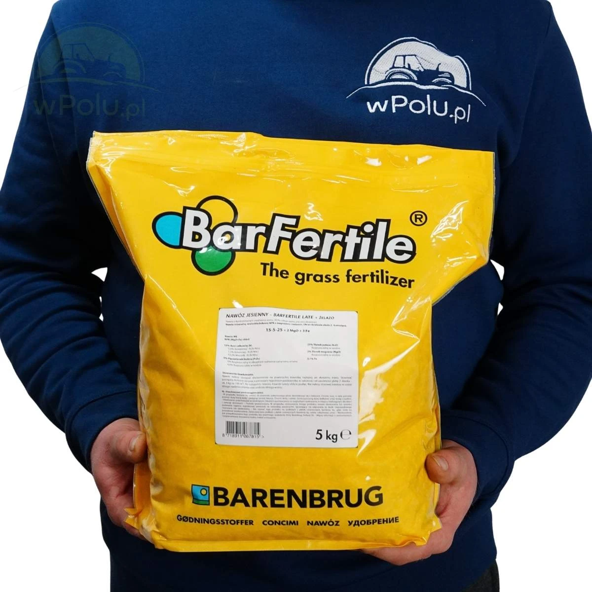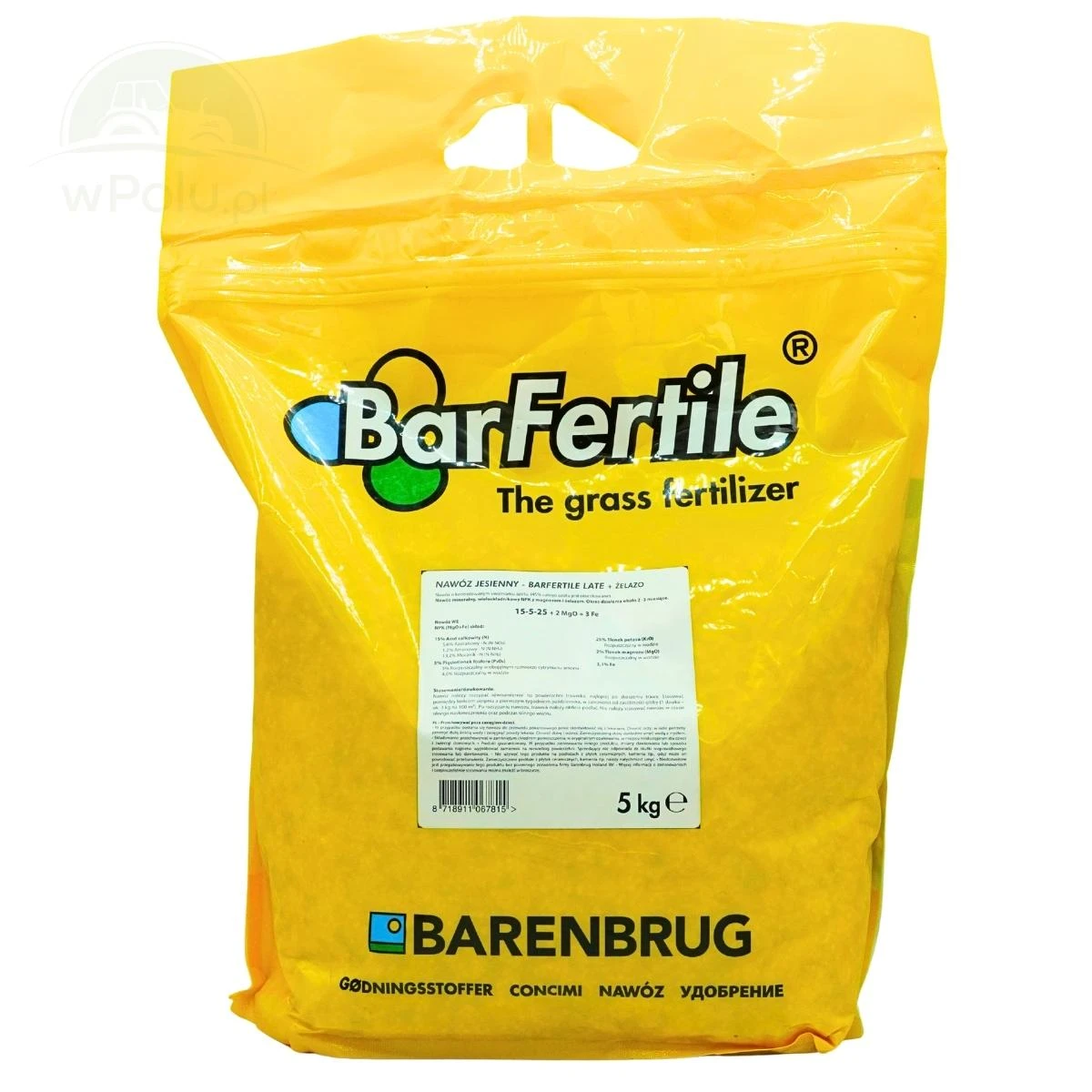 Fosforany, będące składnikami niepowlekanymi, zaczynają rozpadać się bezpośrednio po zastosowaniu nawozu, co pozwala trawie na bardzo szybkie przyswojenie substancji odżywczych. Granulaty posiadają powłokę polimerową BarFertile, która zapewnia uwalnianie wyłącznie pod wpływem temperatury, co jest niezawodną metodą nawożenia muraw sportowych przy dużej zmienności klimatu. Nawóz zapewnia stałe i równomierne uwalnianie substancji odżywczych przez kilka miesięcy. Zawarte w nawozie azot i potas pochodzące z azotanu potasu przyswajalne są przez trawy w 100%. Wpływają na większą intensywność zielonego koloru trawy oraz poprawiają jej ukorzenienie i gęstość. Magnez dodatkowo wzmacnia kolor i odporność trawy, a żelazo pozwala kontrolować mech i zielenienie. BarFertile Late zapewnia odporność trawnika na mróz, choroby i ścieranie. Wysoka zawartość potasu wpływa na darń w kolorze ciemnozielonym.