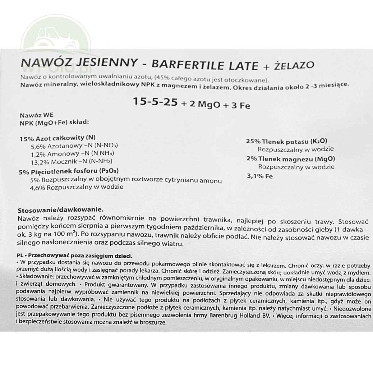 Barenbrug nawóz jesienny do trawników BarFertile Late 15-5-25 + 2MgO + 3Fe to specjalistyczny nawóz granulowany, przeznaczony do przygotowania darni przed zimą.