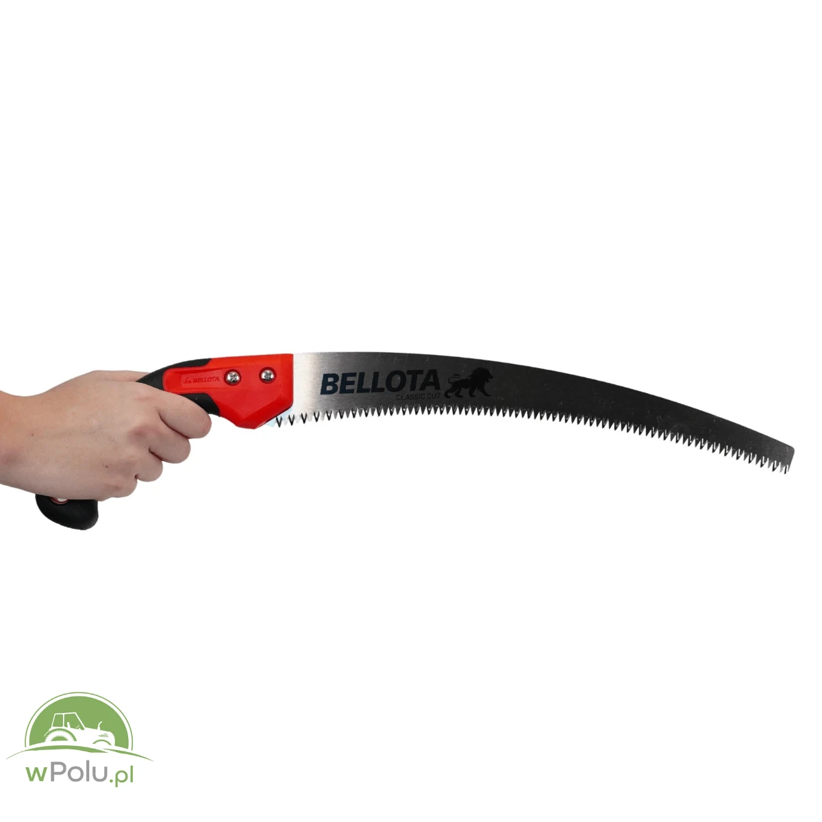 Piła do przycinania Bellota 450BIMR13 to profesjonalne narzędzie z zakrzywionym brzeszczotem 13″ (ok. 330 mm) i prostą, dwumateriałową rękojeścią, przeznaczone do pielęgnacji drzew, prac w sadzie i ogrodzie. Uzębienie japońskie z hartowaniem impulsowym, co nadaje mu dużą twardość i pozwala na długie utrzymywanie ostrości. Trójfazowa geometria zębów zapewniają czyste, szybkie cięcie również w twardszym drewnie, a polerowane wykończenie ostrza ułatwia pracę.