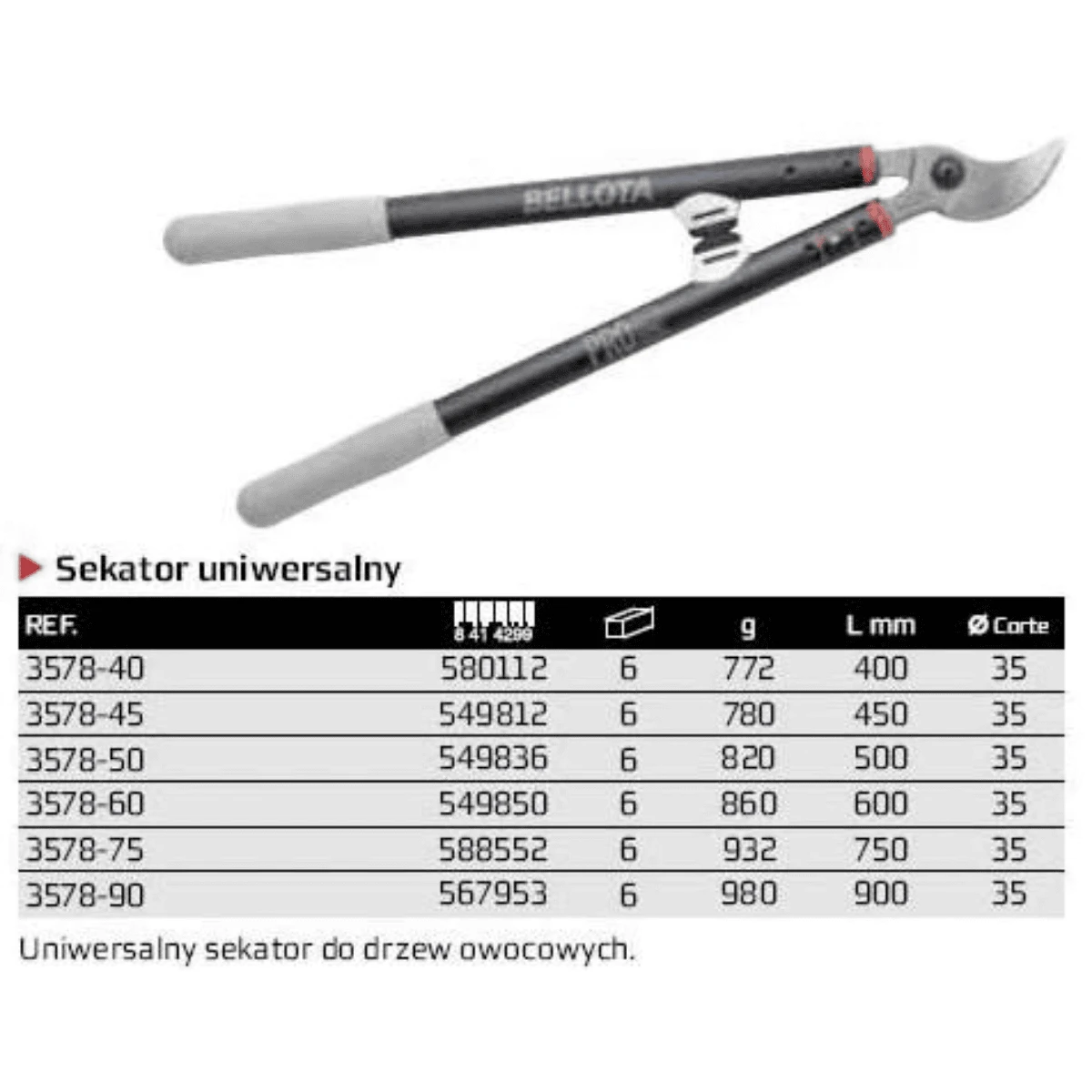 Hiszpański sekator dwuręczny Bellota ProLine 3578-90 o średnicy cięcia 35 mm. Profesjonalne narzędzie przeznaczone do uniwersalnego przycinania winorośli, drzew owocowych i oliwnych. Ostrze oraz przeciwostrze zostały wykute z hartowanej stali odpornej na ścieranie, co znacząco wydłuża żywotność narzędzia nawet przy intensywnym użytkowaniu. Specjalne polerowanie ostrzy zapewnia gładkie i czyste cięcie, ograniczając uszkodzenia roślin.