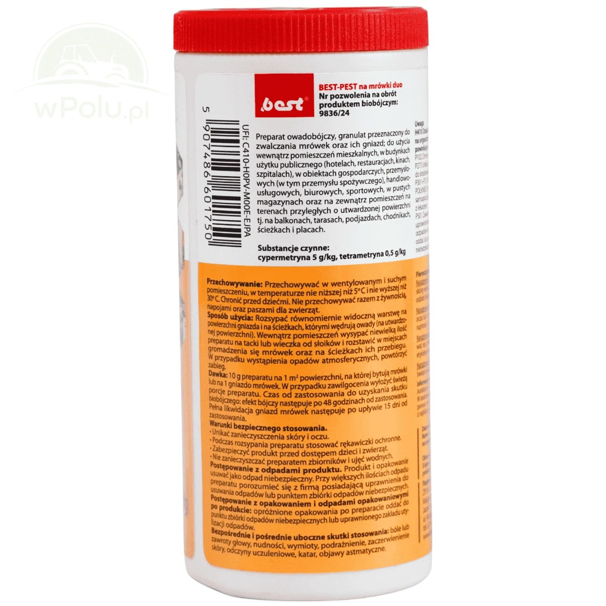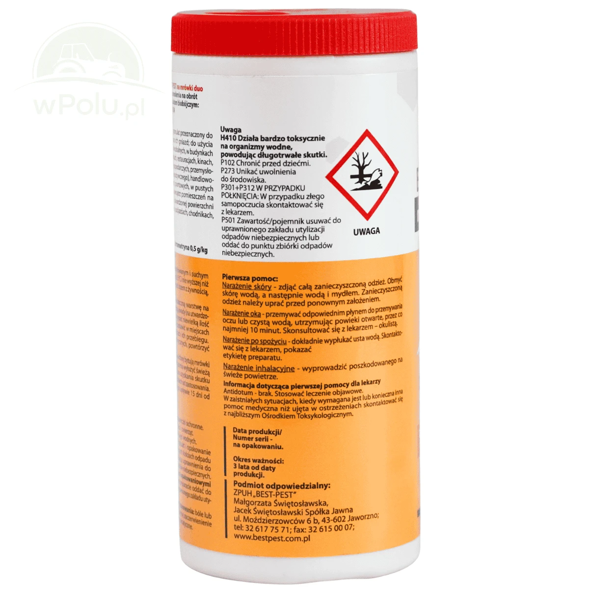 Preparat Best-Pest na mrówki DUO 250 g to skuteczny środek owadobójczy przeznaczony do zwalczania mrówek faraona i innych gatunków mrówek w otoczeniu domowym i ogrodowym. Dzięki podwójnemu działaniu substancji czynnych zapewnia szybki oraz długotrwały efekt już po pierwszym zastosowaniu. Produkt ma formę wygodnego granulatu gotowego do użycia, zapakowanego w praktyczne opakowanie z dozownikiem.