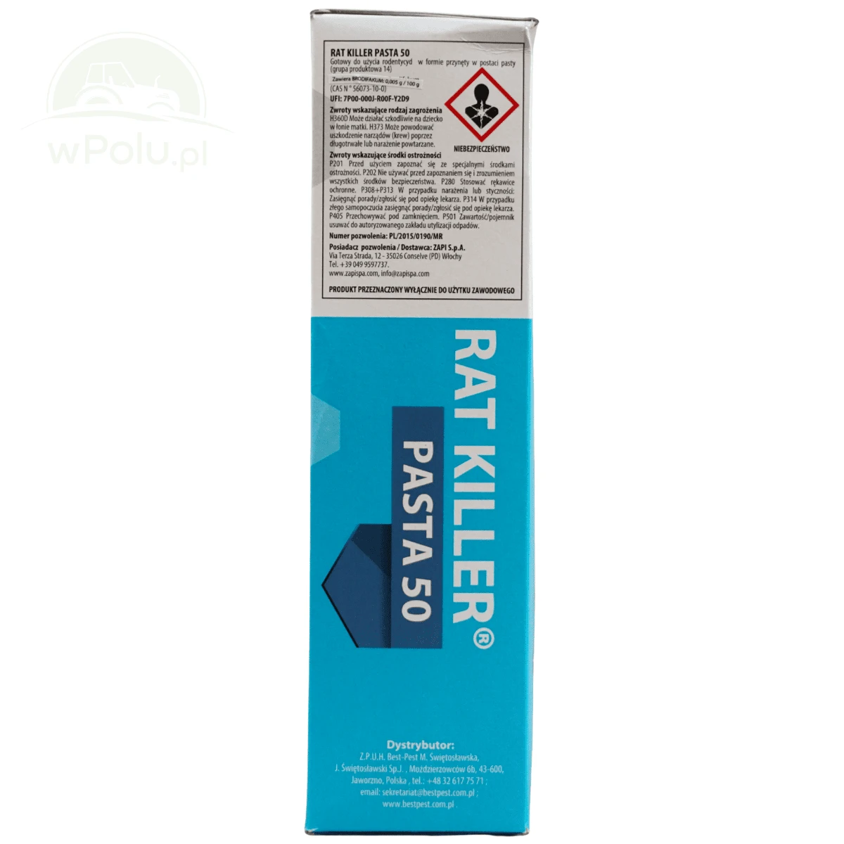 Rat Killer® pasta 50 (BRODITOP pasta) to gotowy do użycia rodentycyd w formie pasty pakowanej w pojedyncze saszetki o wadze około 10 g. Przeznaczony do zwalczania myszy domowej (Mus musculus) i szczura wędrownego (Rattus norvegicus) na wszystkich etapach rozwoju. Może być stosowany zarówno wewnątrz, jak i wokół budynków. Produkt przeznaczony jest wyłącznie dla użytkowników profesjonalnych.