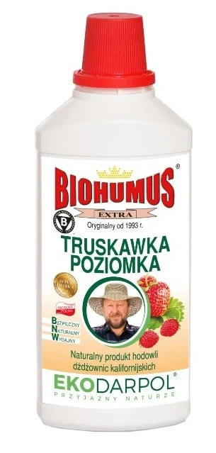 Biohumus extra to w pełni naturalny nawóz w roztworze wodnym przeznaczony do zasilania truskawek i poziomek w uprawie ogrodowej i balkonowej. Gwarantuje zdrowe plony, zapewnia silny rozwój systemu korzeniowego, bujny wzrost roślin, obfite kwitnienie i owocowanie truskawek i poziomek, polepsza także walory smakowe owoców. Posiada bardzo bogatą mikroflorę bakteryjną co wpływa na kondycję i odporność roślin.