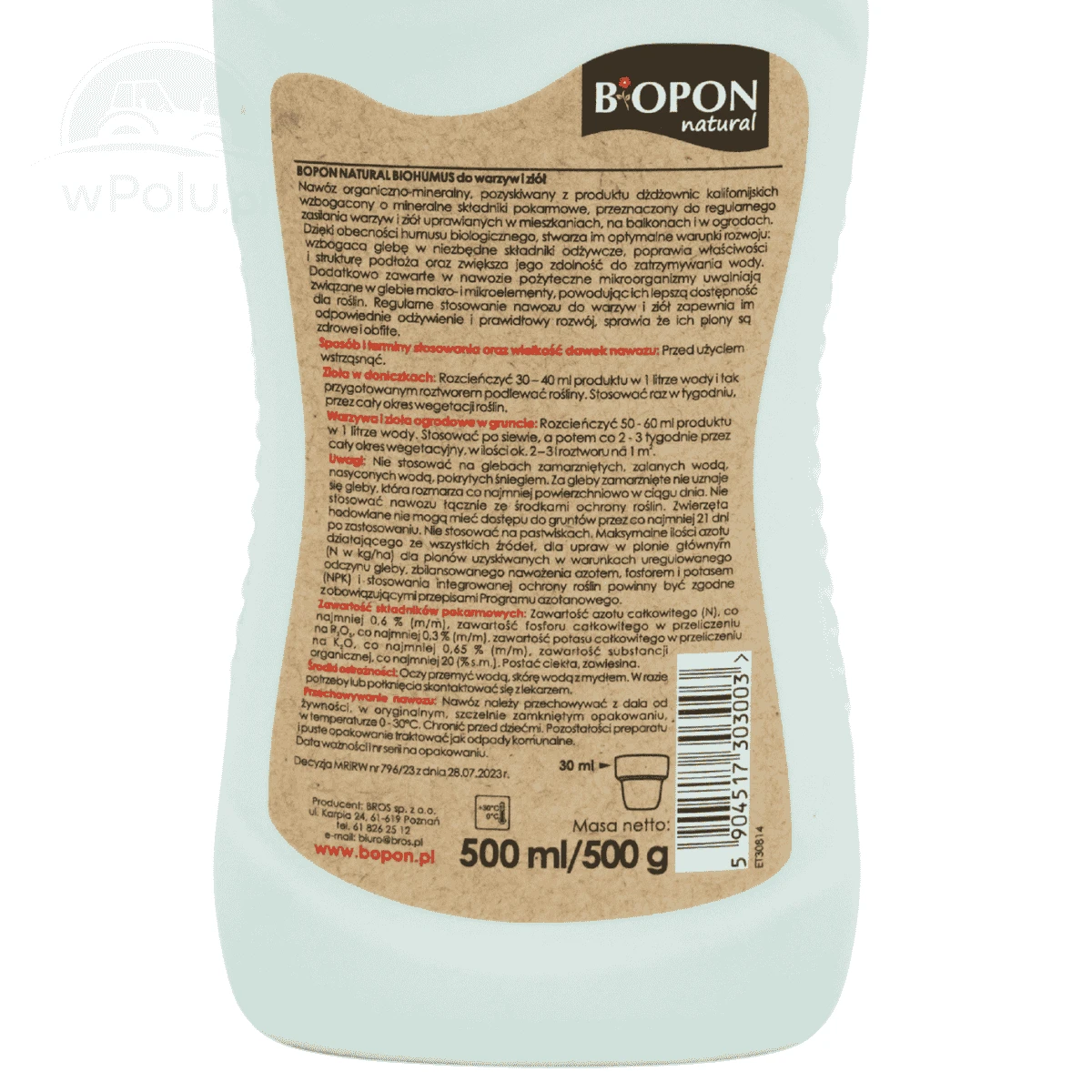 Organiczny środek w 100% naturalny poprawiający właściwości gleby i wzbogacający ją w składniki pokarmowe, powstały na bazie biohumusu, przeznaczony do stosowania w uprawie warzyw i ziół. Wyprodukowany z odchodów dżdżownic kalifornijskich, które podczas trawienia gleby nasycają ją pożytecznymi mikroorganizmami, uwalniającymi związane w podłożu składniki odżywcze. Regularne stosowanie Biohumusu do warzyw i ziół zapewnia roślinom odpowiednie odżywienie i prawidłowy rozwój, sprawia że ich plony są zdrowe i obfite.