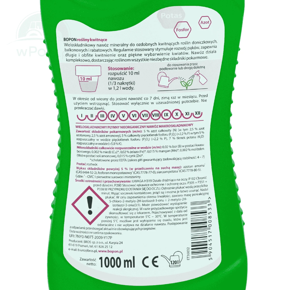 Z jednego opakowania Biopon do roślin kwitnących o pojemności 1 litra wytworzymy 120 litrów cieczy roboczej.
