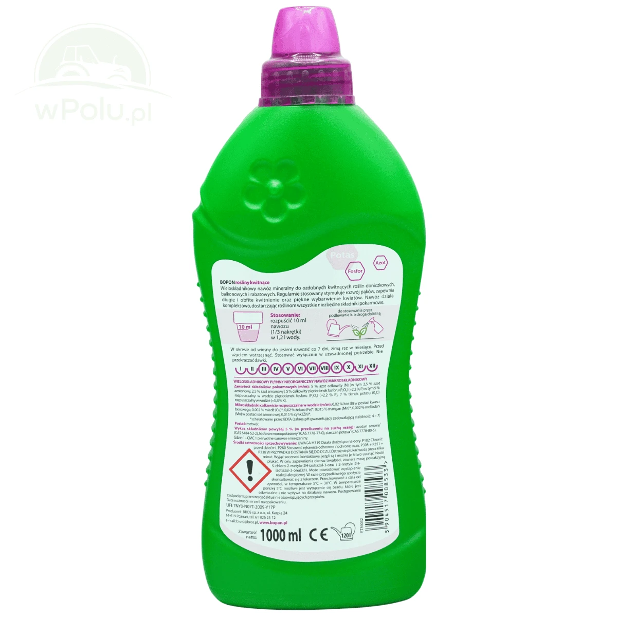 Biopon do roślin kwitnących to wieloskładnikowy nawóz mineralny przeznaczony do ozdobnych roślin kwitnących uprawianych w doniczkach, na balkonach oraz rabatach. Regularne stosowanie wspiera rozwój pąków, zapewnia długotrwałe i obfite kwitnienie oraz intensywne wybarwienie kwiatów. Preparat działa kompleksowo, dostarczając roślinom wszystkie niezbędne składniki odżywcze.