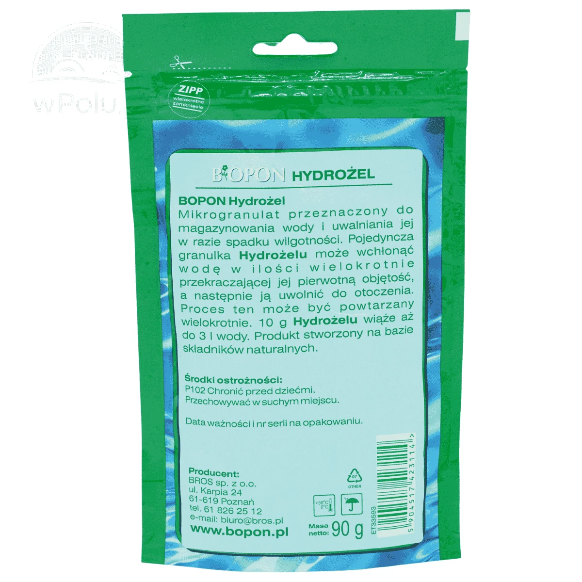 Biopon hydrożel, to mikrogranulat, który zwiększa chłonność podłoża i magazynuje w nim wodę. Granulki Hydrożelu wiążą wodę pochodzącą z podlewania, deszczu i rosy, zatrzymując jej nadmiar, a następnie stopniowo uwalniają do gleby. Dzięki temu rośliny nie odczuwają jej braku w okresach suszy lub zbyt rzadkiego podlewania, a z drugiej strony są chronione przed przelaniem.