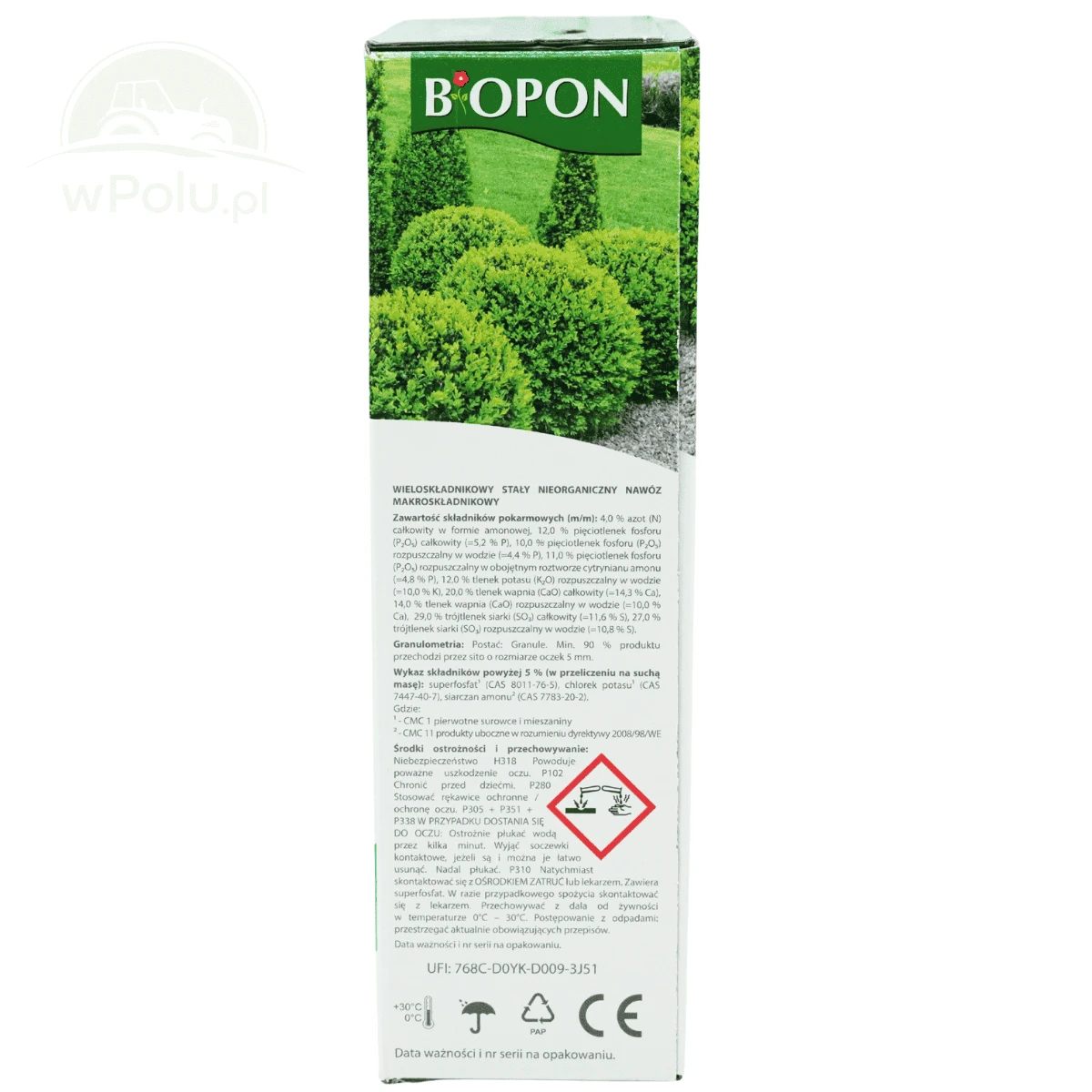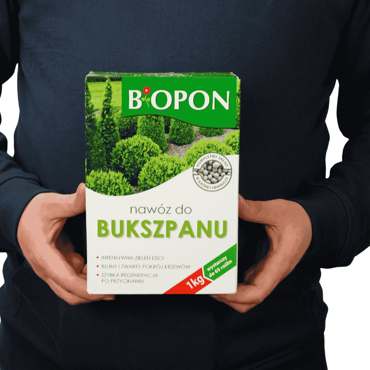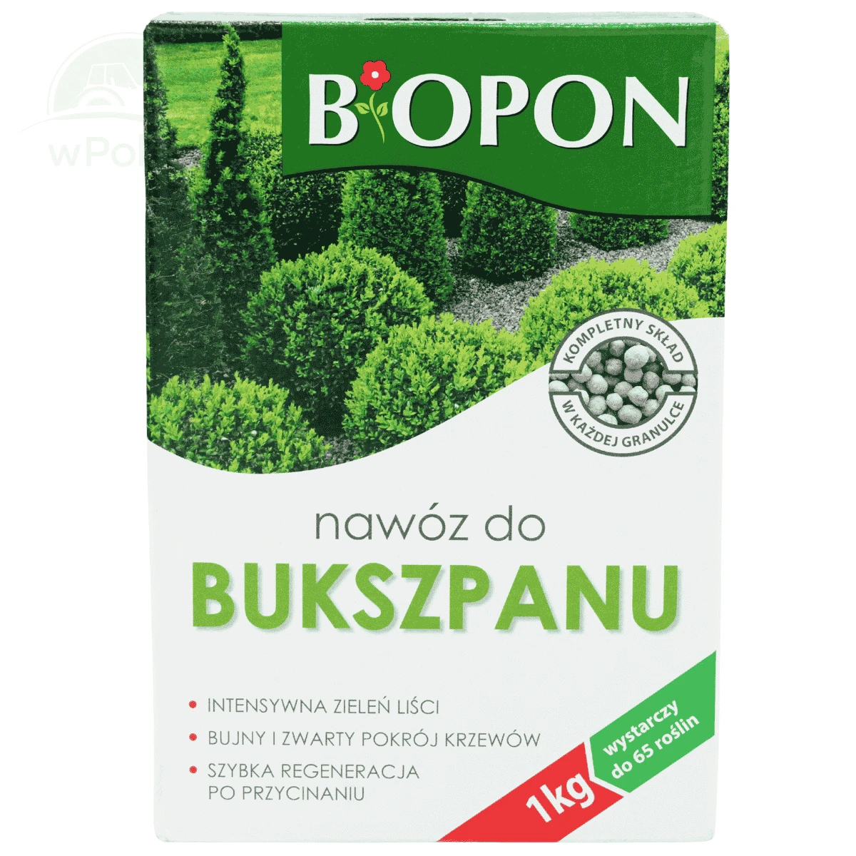 Nawóz do bukszpanu marki Biopon to specjalistyczny nawóz granulowany, wieloskładnikowy, stworzony z myślą o zasilaniu wszystkich odmian bukszpanów. Zawiera starannie zbilansowany zestaw łatwo przyswajalnych makro- i mikroelementów, które wspierają prawidłowy wzrost i piękny wygląd roślin. Regularne stosowanie nawozu zapewnia szybką regenerację po cięciach pielęgnacyjnych oraz uszkodzeniach spowodowanych przez szkodniki, a także sprzyja bujnemu, zwartemu pokrojowi krzewu i intensywnie zielonemu kolorowi liści.