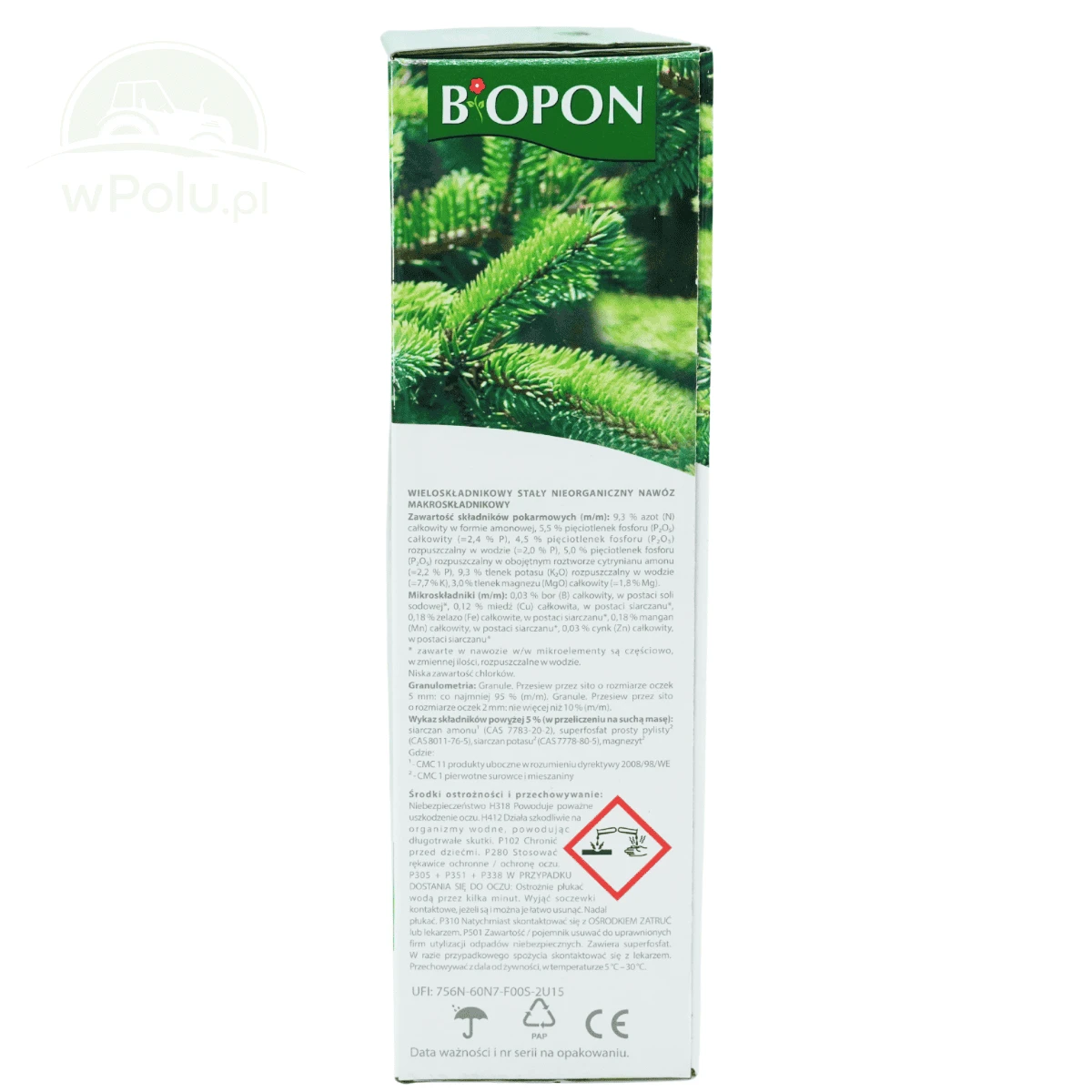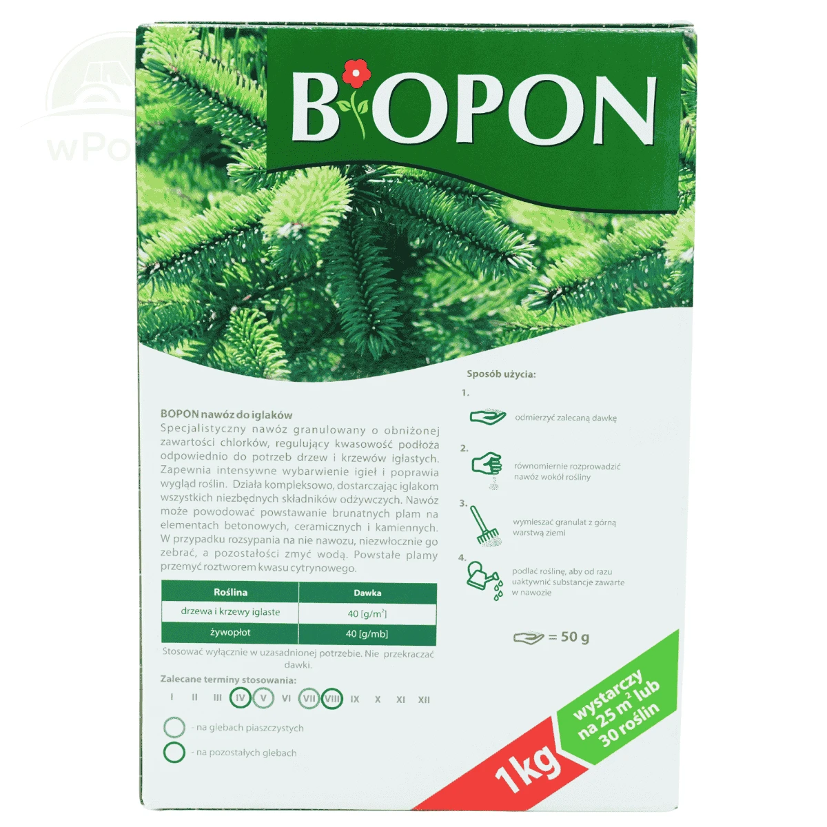 BIOPON do iglaków zawiera wszystkie składniki niezbędne do utrzymania właściwego poziomu kwasowości gleby. Dodatek magnezu zapobiega brązowieniu igieł.