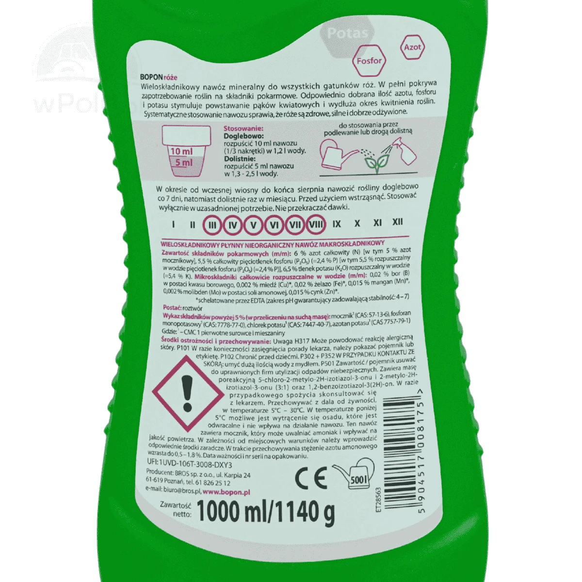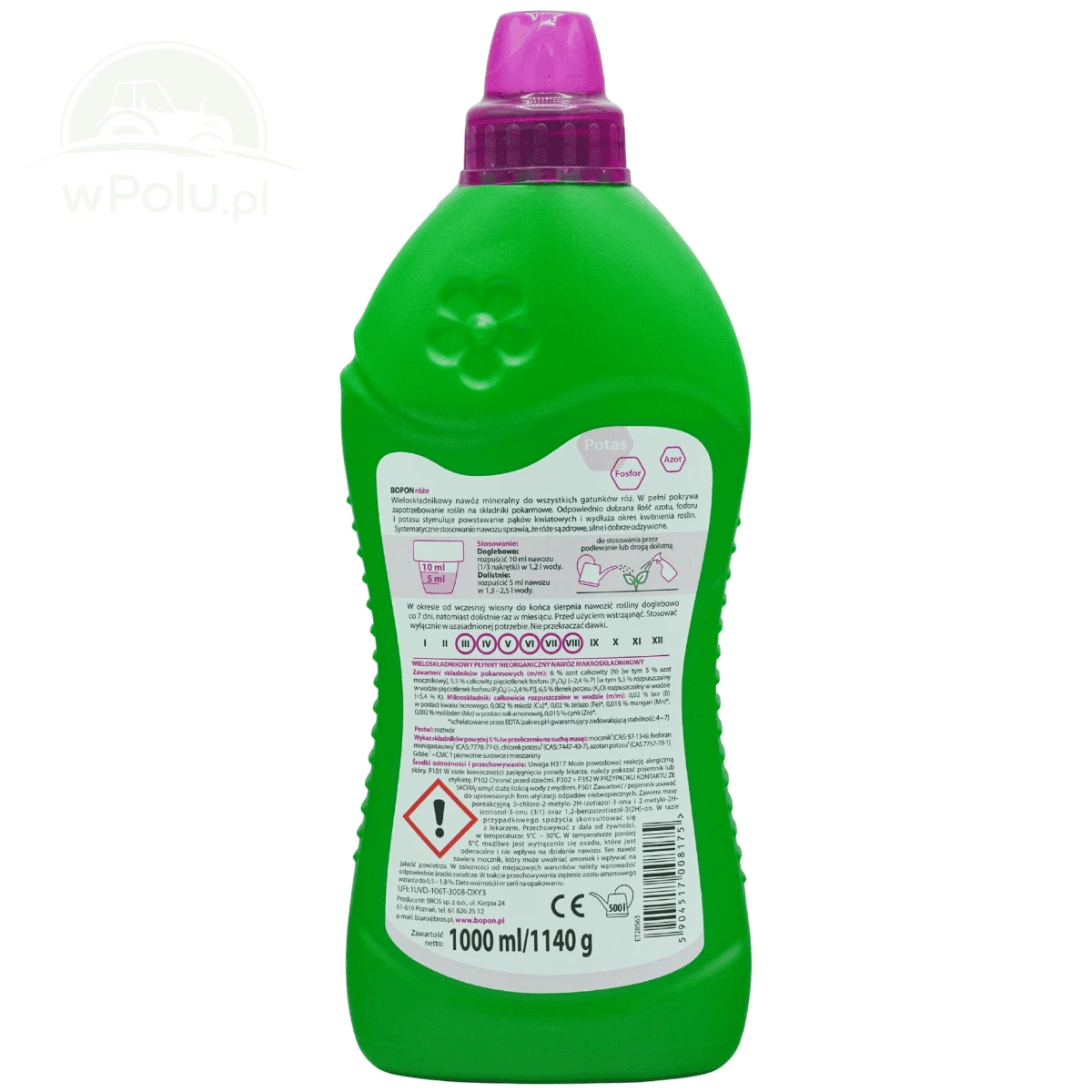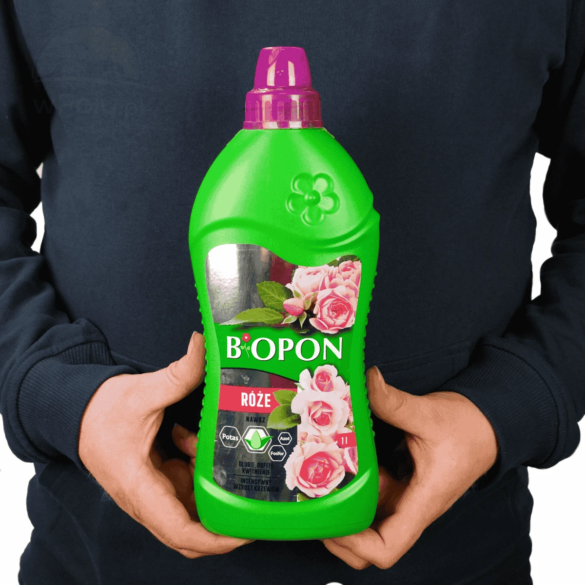 Biopon nawóz płynny do róż jest wielkoskładnikowym nawozem mineralnym. Stosuje się go do wszystkich rodzajów róż. Biopon w pełni pokrywa zapotrzebowanie roślin na składniki pokarmowe. Wysoka zawartość azotu w formie amidowej wydłuża okres działania nawozu. Odpowiednie proporcje fosforu i potasu stymulują powstawanie pąków kwiatowych i wydłużają okres kwitnienia roślin. Nawożenie należy rozpoczynać wiosną i zakończyć pod koniec sierpnia. Stosować doglebowo co 7 dni, natomiast dolistnie raz w miesiącu. Przekroczona dawka nawozu może spowodować uszkodzenie lub zniszczenie roślin.