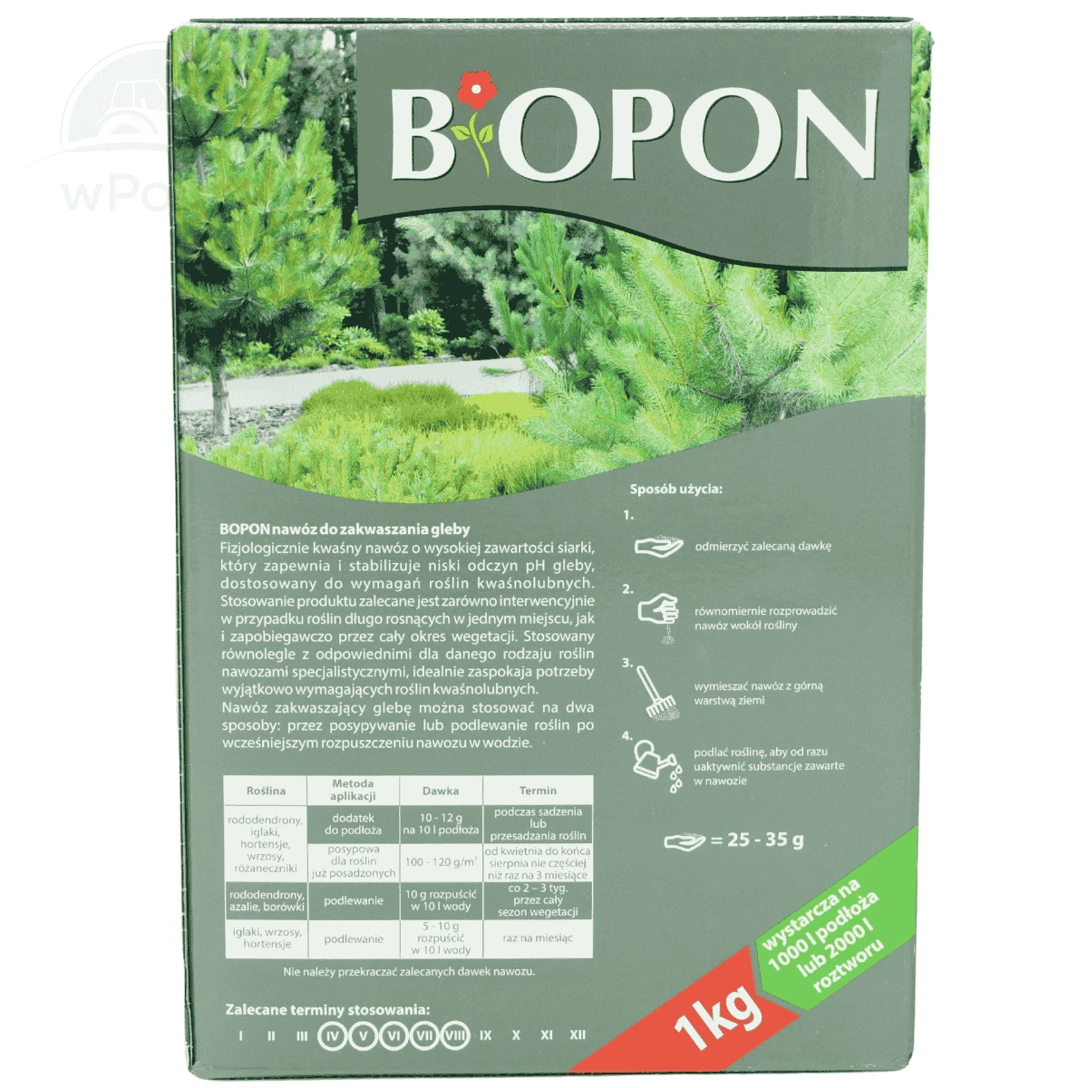 Nawóz do zakwaszania gleby jest przeznaczony do zastosowania w celu utrzymania i stabilizacji niskiego poziomu pH gleby, co jest korzystne dla roślin kwaśnolubnych. Produkt posiada wysoką zawartość siarki, co może pomóc w obniżeniu pH gleby, dostosowując ją do potrzeb roślin preferujących kwaśne warunki.