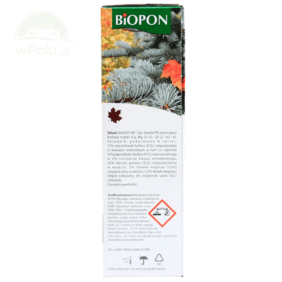 Wieloskładnikowy granulat o jednolitej konsystencji (kompletny skład w każdej granulce) do nawożenia doglebowego. Optymalny dobór składników długotrwale uzupełnia niedobory minerałów w glebie i tworzy zapasy składników odżywczych potrzebnych do rozpoczęcia wegetacji w następnym sezonie. Brak azotu hamuje przyrost roślin, a duża porcja potasu zwiększa odporność na wymarzanie. Nawóz zapewnia prawidłowe wybarwienie igieł i wspomaga proces drewnienia, przez co tworzy dodatkową ochronę przed mrozem.