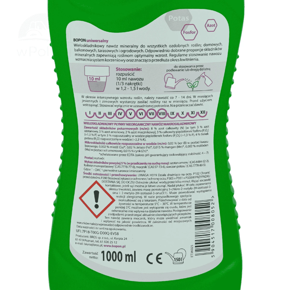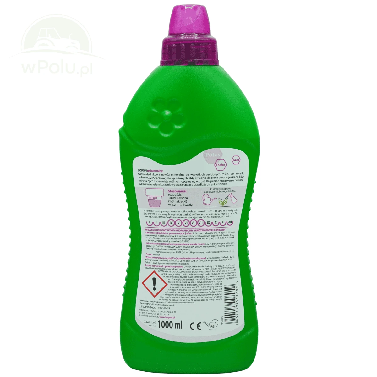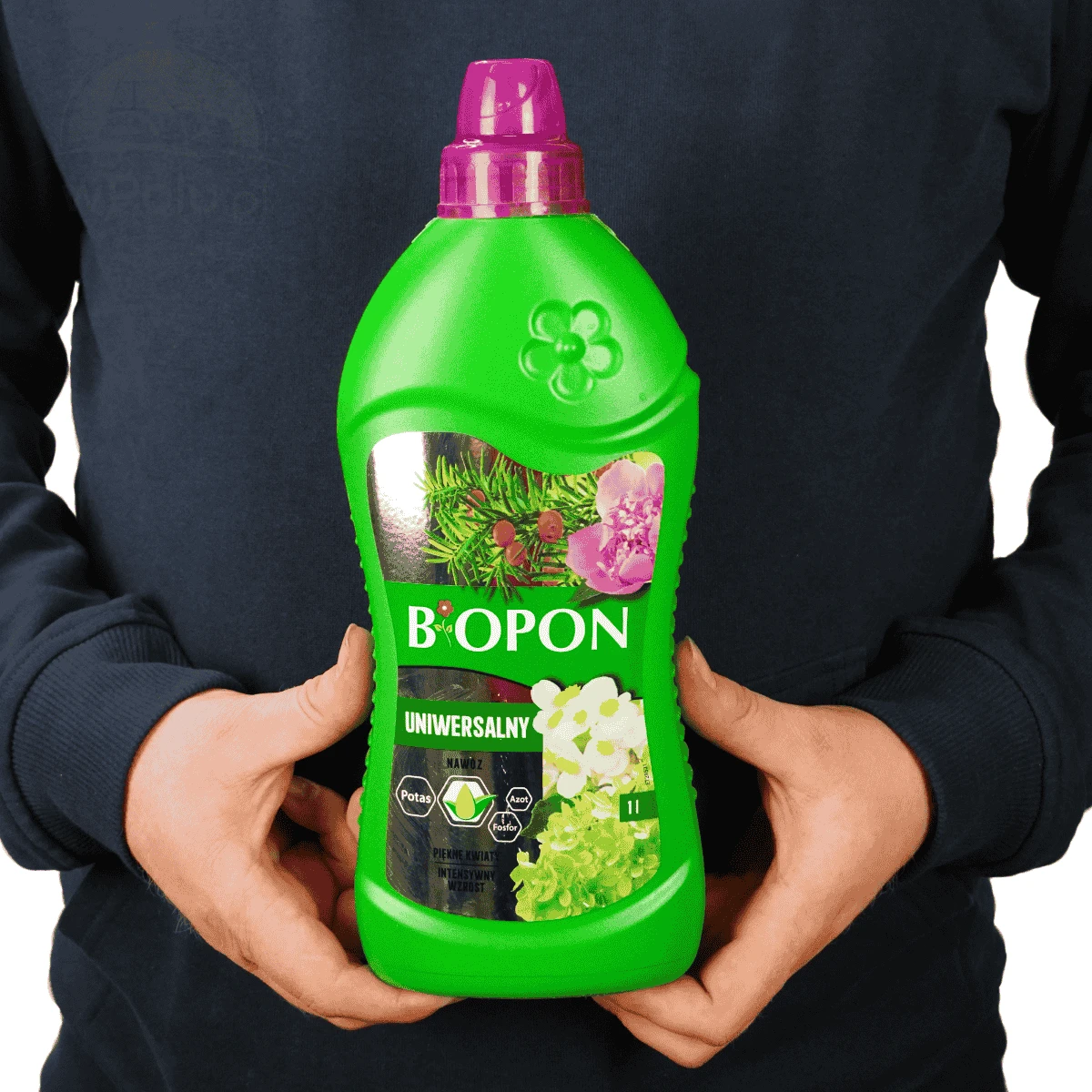 Nawóz uniwersalny Biopon w butelce o pojemności 1 litra pozwala na przygotowanie od 120 litrów do 150 litrów cieczy roboczej.