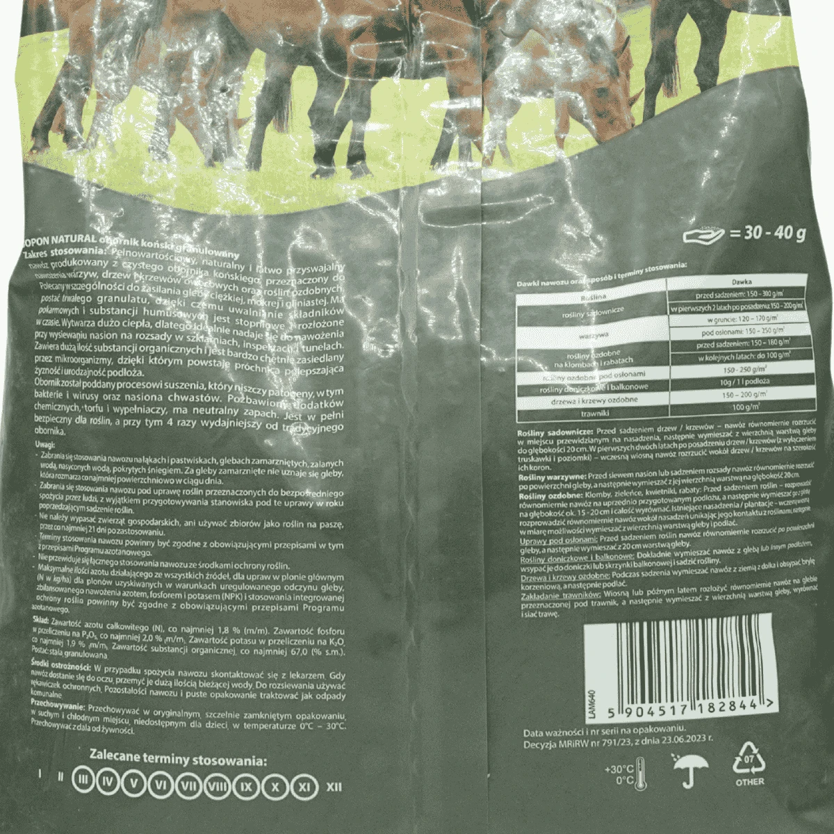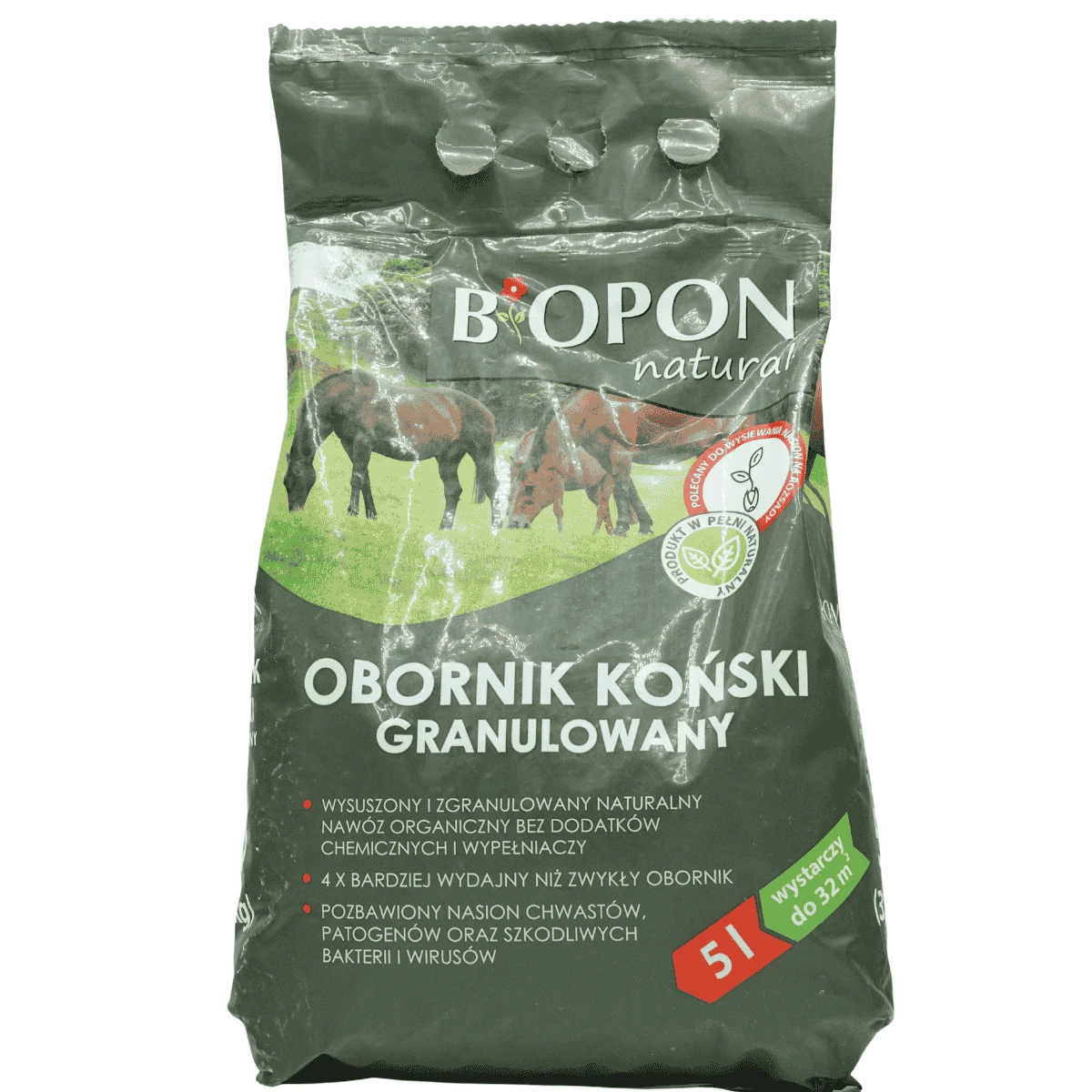 Obornik granulowany koński jest pełnowartościowy, naturalny i łatwo przyswajalny nawóz produkowany z czystego obornika końskiego, przeznaczony do nawożenia warzyw, drzew i krzewów owocowych oraz roślin ozdobnych. Polecany w szczególności do zasilania gleby ciężkiej, mokrej i gliniastej. Ma postać trwałego granulatu, dzięki czemu uwalnianie składników pokarmowych i substancji humusowych jest stopniowe i rozłożone w czasie. Wytwarza dużo ciepła, dlatego idealnie nadaje się do nawożenia przy wysiewaniu nasion na rozsady w szklarniach, inspektach i tunelach. Zawiera dużą ilość substancji organicznych i jest bardzo chętnie zasiedlany przez mikroorganizmy, dzięki którym powstaje próchnica polepszająca żyzność i urodzajność podłoża.