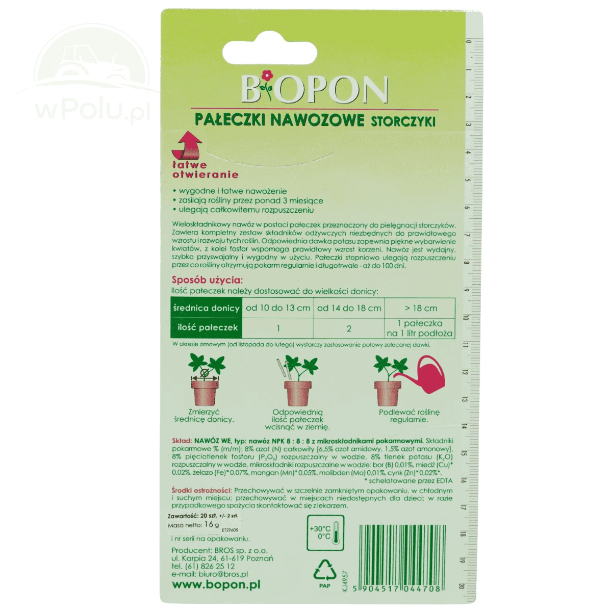 Wieloskładnikowy nawóz w postaci pałeczek przeznaczony do pielęgnacji storczyków. Zawiera kompletny zestaw składników odżywczych niezbędnych do prawidłowego wzrostu i rozwoju tych roślin. Odpowiednia dawka potasu zapewnia piękne wybarwienie kwiatów bez przebarwień i plam, z kolei fosfor wspomaga prawidłowy wzrost korzeni. Nawóz jest wydajny, szybko przyswajalny i wygodny w użyciu. Pałeczki stopniowo ulegają rozpuszczeniu, przez co rośliny otrzymują pokarm regularnie i długotrwale – ponad 3 miesiące.
