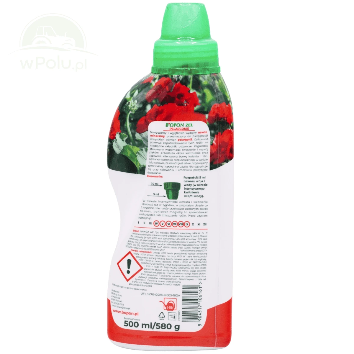 Nowoczesny i wyjątkowo wydajny nawóz mineralny, przeznaczony do pielęgnacji wszystkich odmian pelargonii. Regularnie stosowany wspomaga tworzenie i rozwój pąków, przedłuża okres kwitnienia oraz zapewnia intensywną barwę kwiatów i liści. Całkowicie pokrywa zapotrzebowanie tych roślin na niezbędne składniki odżywcze. Gęsta konsystencja rozpuszczalnego w wodzie żelu sprawia, że nawóz jest łatwo przyswajalny przez rośliny i wygodny w użyciu. Nie rozpryskuje się przy nalewaniu i umożliwia precyzyjne dozowanie.