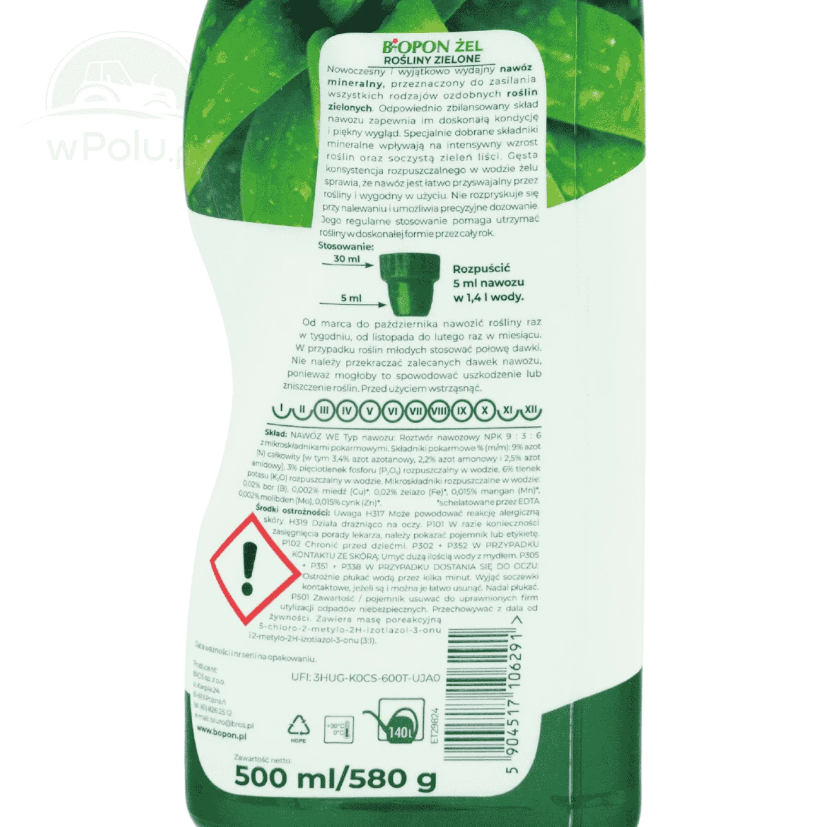 Nowoczesny i wyjątkowo wydajny nawóz mineralny, przeznaczony do zasilania wszystkich rodzajów ozdobnych roślin zielonych. Specjalnie dobrane składniki mineralne wpływają na intensywny wzrost roślin oraz soczystą zieleń liści. Gęsta konsystencja rozpuszczalnego w wodzie żelu sprawia, że nawóz jest łatwo przyswajalny przez rośliny i wygodny w użyciu. Odpowiednio zbilansowany skład nawozu zapewnia im doskonałą kondycję i piękny wygląd. Nie rozpryskuje się przy nalewaniu i umożliwia precyzyjne dozowanie. Jego regularne stosowanie pomaga utrzymać rośliny w doskonałej formie przez cały rok.