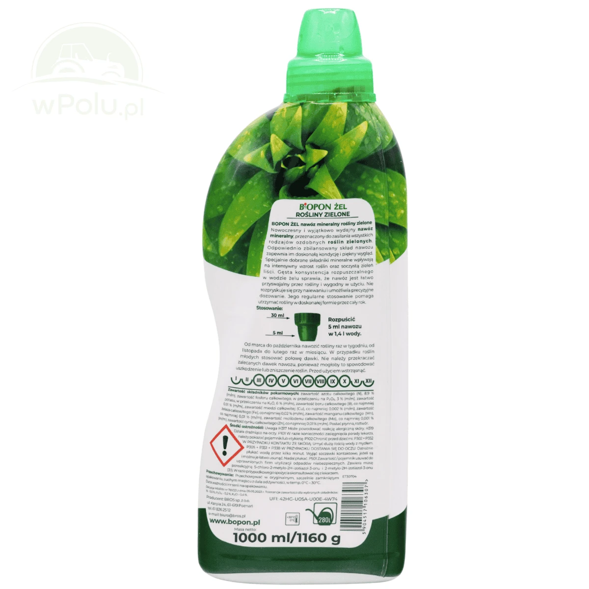Żel do roślin zielonych od firmy Biopon to wieloskładnikowy nawóz mineralny stworzony z myślą o zasilaniu wszystkich rodzajów zielonych roślin ozdobnych. Starannie zbilansowany skład dostarcza niezbędnych składników odżywczych, zapewniając roślinom doskonałą kondycję i intensywną zieleń liści. Specjalnie dobrane minerały wspierają dynamiczny wzrost roślin oraz podkreślają ich piękny wygląd. Regularne stosowanie nawozu pozwala utrzymać rośliny w doskonałej formie przez cały rok.