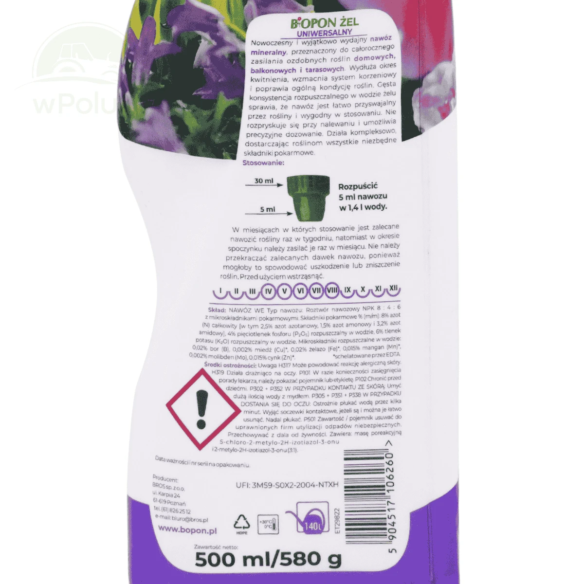 Biopon żel, to nowoczesny i wyjątkowo wydajny nawóz mineralny, przeznaczony do całorocznego zasilania ozdobnych roślin domowych, balkonowych i tarasowych. Wydłuża okres kwitnienia, wzmacnia system korzeniowy i poprawia ogólną kondycję roślin. Gęsta konsystencja rozpuszczalnego w wodzie żelu sprawia, że nawóz jest łatwo przyswajalny przez rośliny i wygodny w użyciu. Nie rozpryskuje się przy nalewaniu i umożliwia precyzyjne dozowanie. Działa kompleksowo, dostarczając roślinom wszystkie niezbędne składniki pokarmowe.