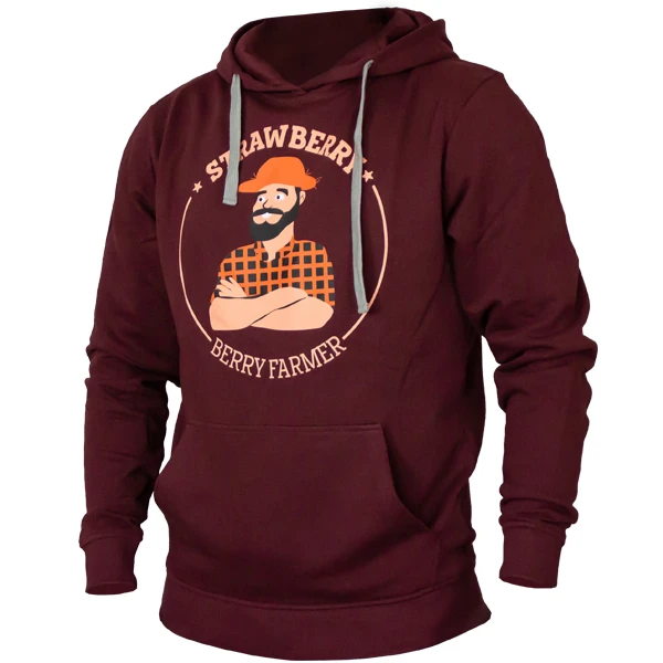 Wygodna uniwersalna bluza z kapturem z nadrukiem farmera "Strawberry Berry Farmer", zaprojektowana z myślą o plantatorach truskawek. Świetnie sprawdzi się podczas chłodniejszej pogody. Bluza posiada kaptur wyścielony od wewnątrz materiałem szczotkowanym, kieszeń typu „kangurek” oraz wykończona jest elastycznymi ściągaczami. Kaptur regulowany jest za pomocą sznurka w kolorze szarym. Niepowtarzalny nadruk nadaje bluzie ciekawego charakteru.