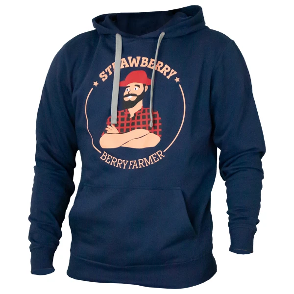 Wygodna uniwersalna bluza z kapturem z nadrukiem farmera "Strawberry Berry Farmer", zaprojektowana z myślą o plantatorach truskawek. Świetnie sprawdzi się podczas chłodniejszej pogody. Bluza posiada kaptur wyścielony od wewnątrz materiałem szczotkowanym, kieszeń typu „kangurek” oraz wykończona jest elastycznymi ściągaczami. Kaptur regulowany jest za pomocą sznurka w kolorze szarym. Niepowtarzalny nadruk nadaje bluzie ciekawego charakteru.