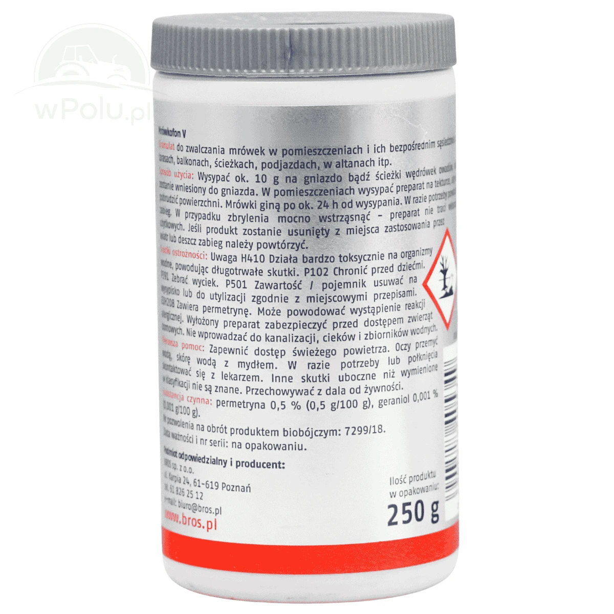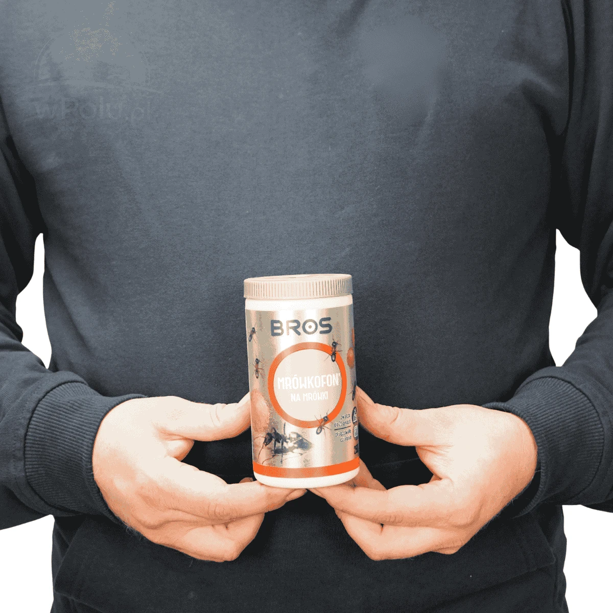 BROS Mrówkofon to gotowy do użycia preparat w formie granulatu, przeznaczony do zwalczania mrówek w pomieszczeniach oraz ich bezpośrednim otoczeniu, takich jak tarasy, balkony, altany, podjazdy czy ścieżki ogrodowe. Produkt zawiera substancję czynną – permetrynę – oraz geraniol, które skutecznie eliminują całe kolonie mrówek. Dzięki specjalnie dobranej przynęcie pokarmowej, granulat jest wyjątkowo atrakcyjny dla owadów i działa już po pierwszej aplikacji.