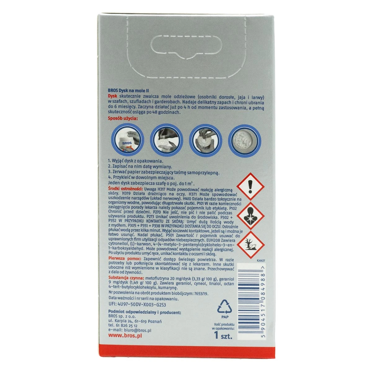 DO RABATU NA WYSYŁKĘ: 1000 złDysk na mole to praktyczne rozwiązanie do zwalczania moli odzieżowych we wszystkich stadiach rozwoju – od jaj, przez larwy, aż po dorosłe osobniki. Produkt zaczyna działać już po 4 godzinach od umieszczenia w szafie, a pełną skuteczność osiąga po 48 godzinach. Ochrona utrzymuje się nawet do 6 miesięcy, skutecznie zabezpieczając ubrania, futra i inne tkaniny przed zniszczeniami.