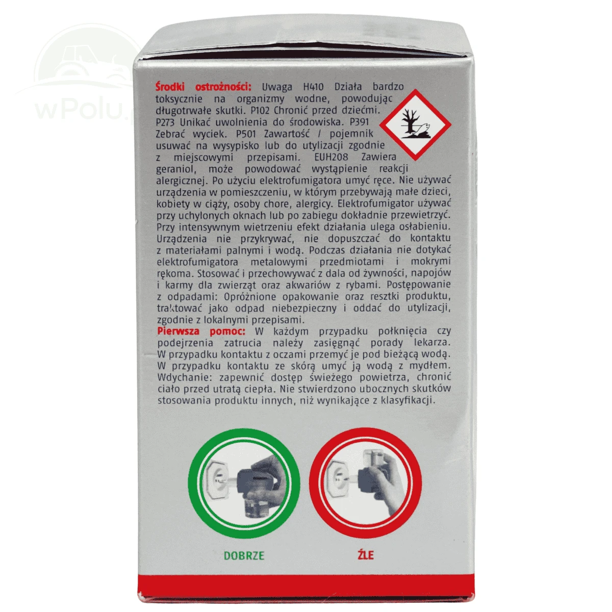 Elektrofumigator przeznaczony jest do zwalczania komarów wewnątrz pomieszczeń. Skutecznie chroni wnętrza mieszkalne, sypialnie czy biura, zabezpieczając powierzchnię do 20 m² (ok. 50 m³).