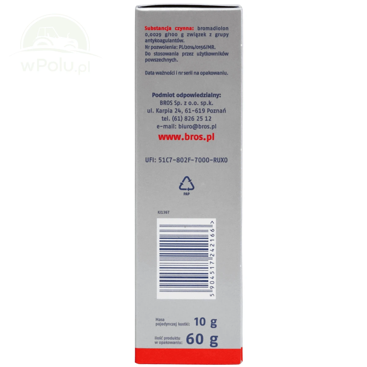 Trutka ma myszy firmy Bros to gotowa do użycia przynęta w formie kostki, umieszczona w karmniku przeznaczonym do zwalczania myszy wewnątrz budynków. Kostka zawiera silnie wabiącą substancję i działa z kilkudniowym opóźnieniem, co zapobiega kojarzeniu trutki ze śmiercią innych gryzoni. Preparat posiada właściwości mumifikujące oraz zawiera barwnik i substancję odstraszającą ludzi i zwierzęta domowe od spożycia. Karmnik umożliwia bezpieczne wyłożenie trutki bez konieczności jej dotykania, a małe otwory po bokach pozwalają myszom na łatwy dostęp do preparatu. Pojemnik można otworzyć wyłącznie za pomocą specjalnego klucza dołączonego do zestawu, co skutecznie zapobiega przypadkowemu spożyciu trutki przez dzieci, zwierzęta domowe czy ptaki.