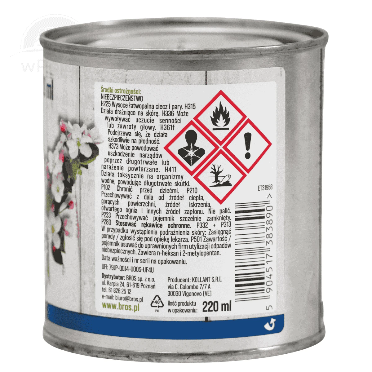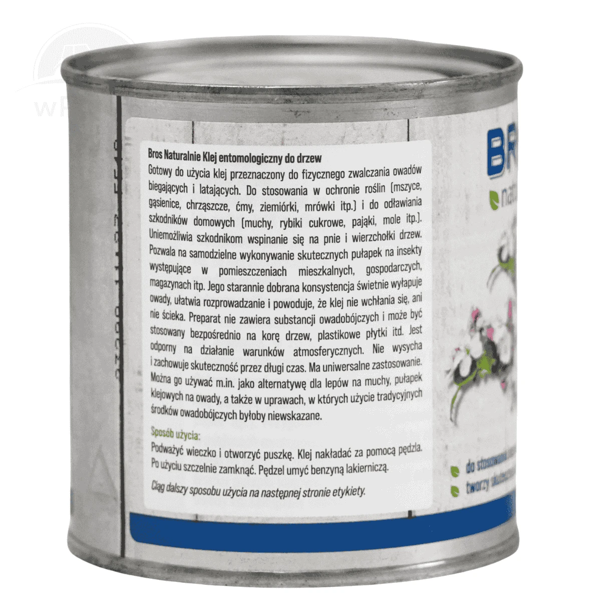 Bros Naturalnie Klej Entomologiczny do Drzew to gotowy do użycia preparat przeznaczony do fizycznego zwalczania owadów biegających i latających. Stosowany w ochronie roślin, skutecznie zabezpiecza pnie drzew przed wspinającymi się szkodnikami takimi jak mrówki, gąsienice czy mszyce. Produkt tworzy trwałą, lepką barierę, która uniemożliwia owadom przemieszczanie się i dostawanie do korony drzew oraz wierzchołków roślin. Może być także stosowany w pomieszczeniach, szklarniach czy magazynach do przygotowywania własnych pułapek na insekty domowe – muchy, mole, rybiki czy pająki.