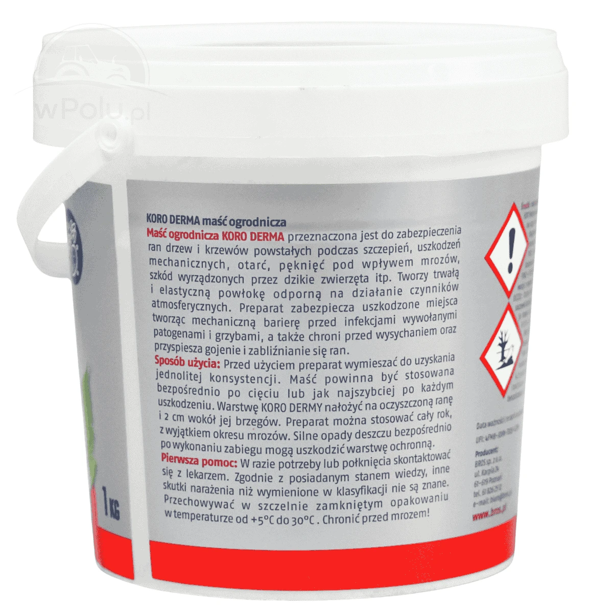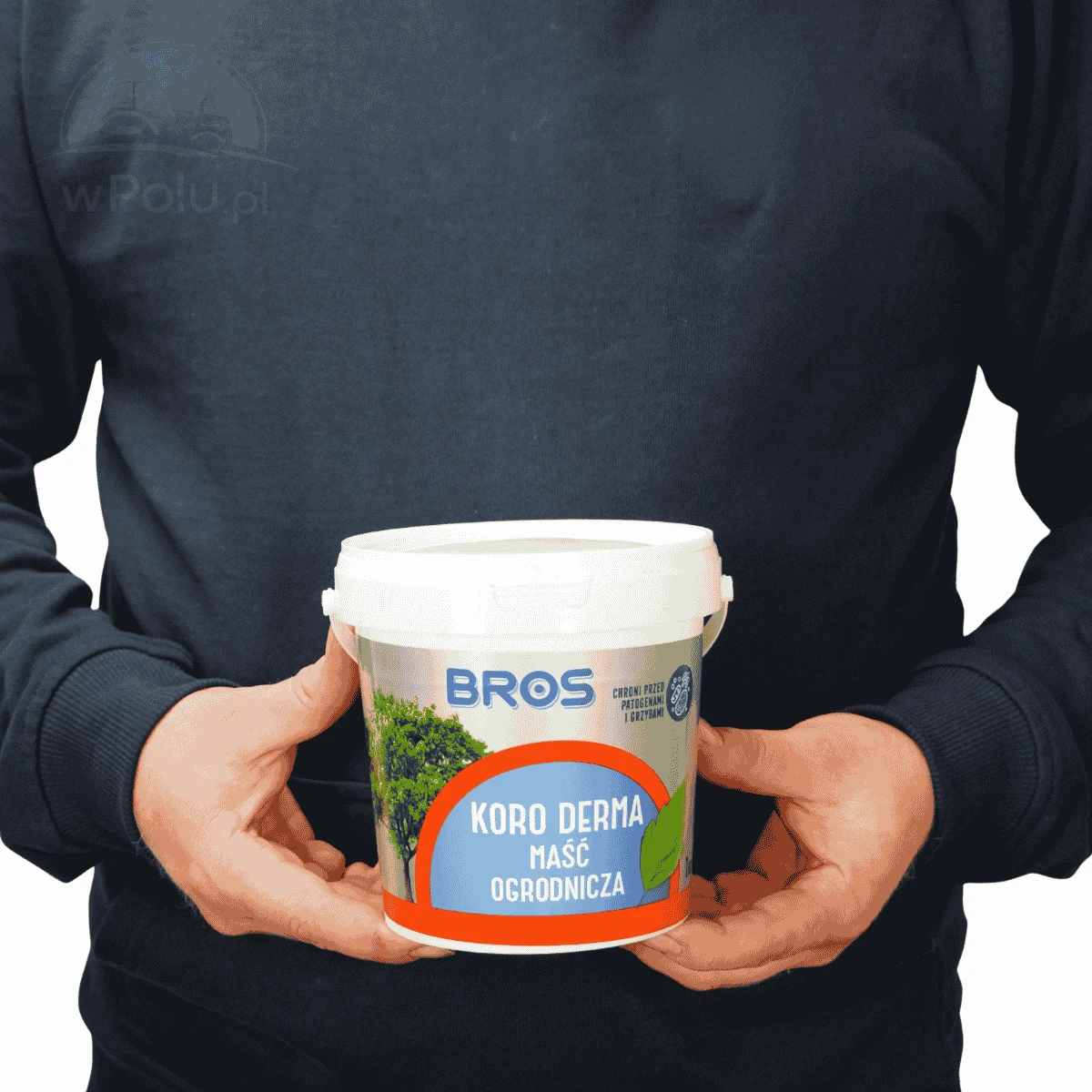 Maść ogrodnicza Bros Koro-Derma przeznaczona do zabezpieczania ran drzew i krzewów, które powstały podczas różnych uszkodzeń mechanicznych, pęknięć spowodowanymi przez mrozy, otarć, szkód wyrządzonych przez dzikie zwierzęta itp.