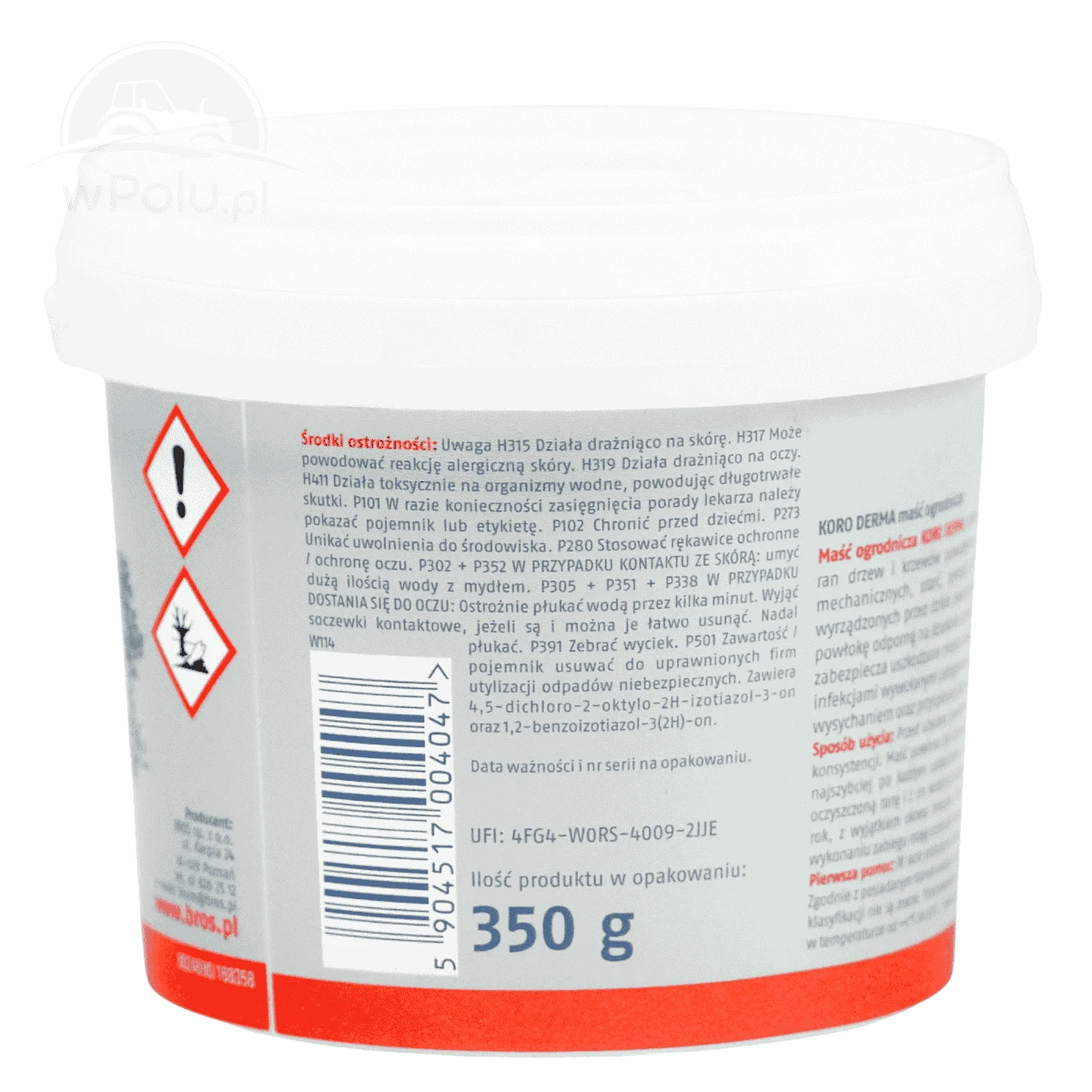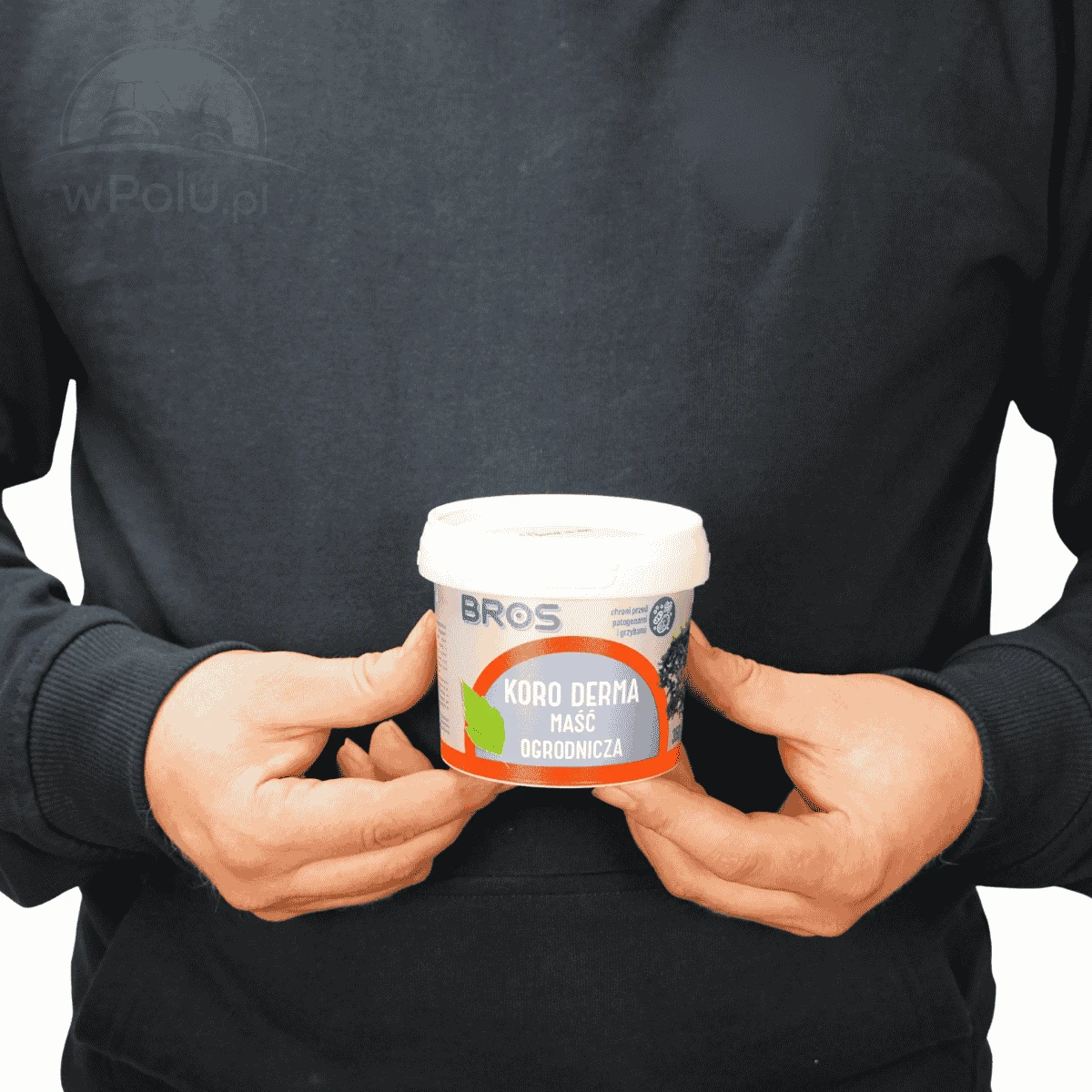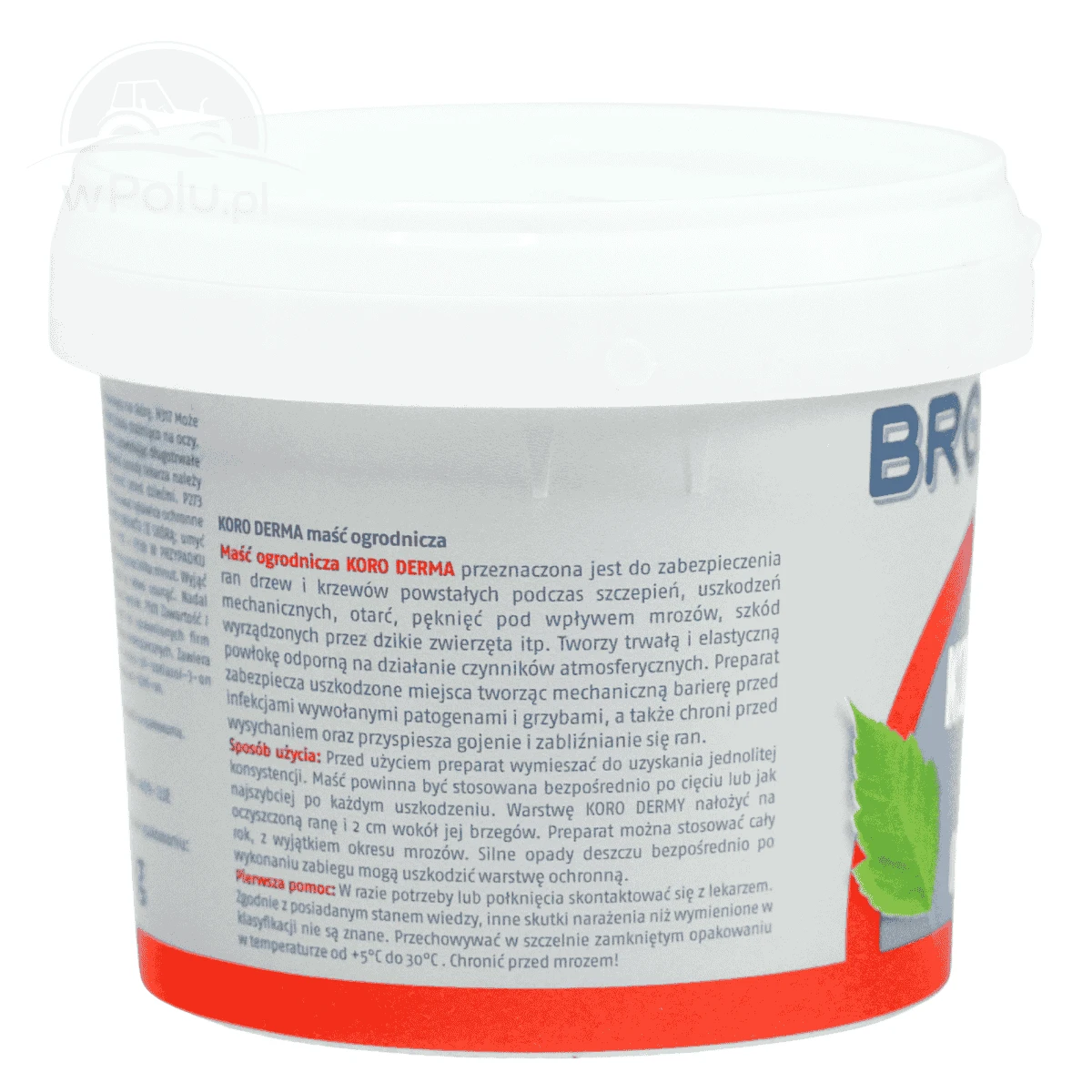 Maść ogrodnicza Koro-Derma od firmy Bros jest przeznaczona do ochrony ran drzew i krzewów powstałych w wyniku uszkodzeń mechanicznych, pęknięć mrozowych, otarć czy szkód spowodowanych przez dzikie zwierzęta. Skutecznie zabezpiecza uszkodzone miejsca. Maść tworzy trwałą i elastyczną powłokę w miejscu aplikacji, która skutecznie opiera się działaniu czynników atmosferycznych. Dodatkowo zapobiega wysychaniu oraz wspiera ich zamykanie i regenerację.